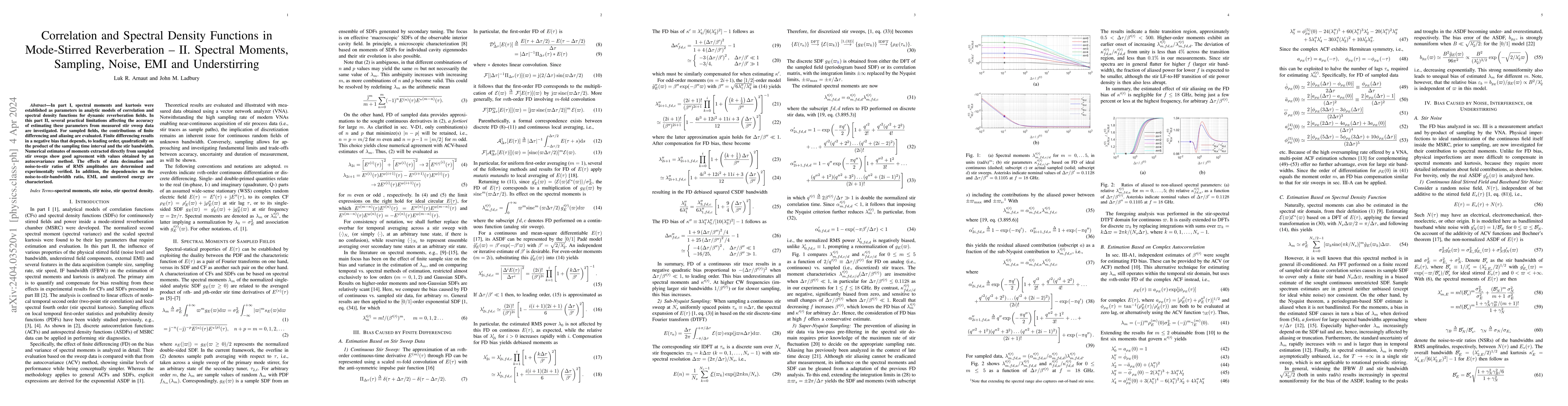 Part II investigates practical limitations affecting the accuracy of estimating spectral moments from mode-stirred reverberation data, focusing on the impact of finite differencing, aliasing, noise, EMI, and understirring. Results show good agreement between numerical and autocovariance methods for estimating spectral moments.