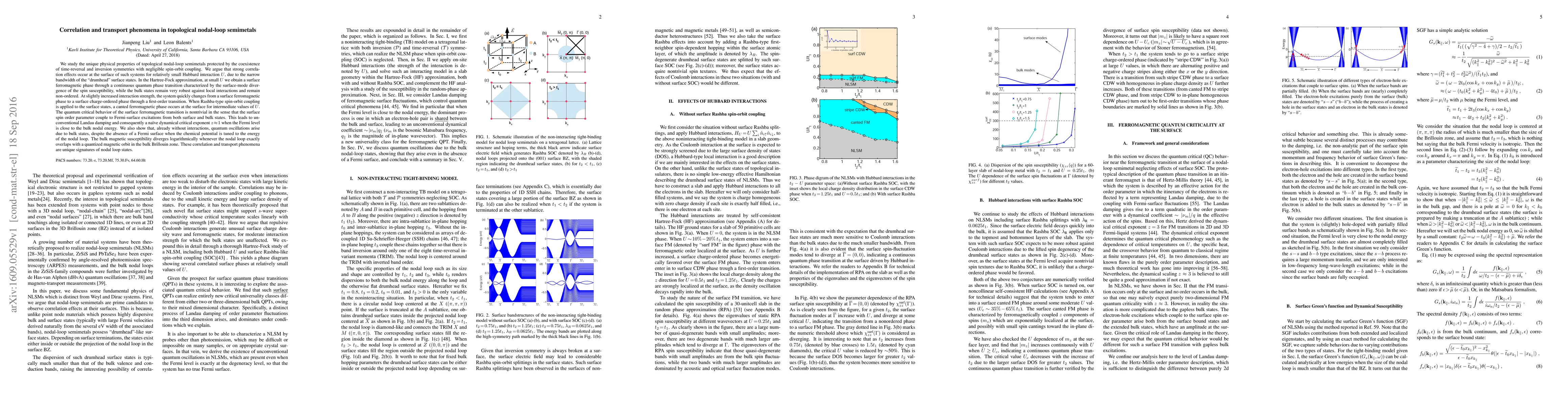 We study the unique physical properties of topological nodal-loop semimetals protected by the coexistence of time-reversal and inversion symmetries with negligible spin-orbit coupling. We argue that strong correlation effects occur at the surface of such systems for relatively small Hubbard interaction $U$, due to the narrow bandwidth of the "drumhead" surface states. In the Hartree-Fock approximation, at small $U$ we obtain a surface ferromagnetic phase through a continuous quantum phase transition characterized by the surface-mode divergence of the spin susceptibility, while the bulk states remain very robust against local interactions and remain non-ordered. At slightly increased interaction strength, the system quickly changes from a surface ferromagnetic phase to a surface charge-ordered phase through a first-order transition. When Rashba-type spin-orbit coupling is applied to the surface states, a canted ferromagnetic phase occurs at the surface for intermediate values of $U$. The quantum critical behavior of the surface ferromagnetic transition is nontrivial in the sense that the surface spin order parameter couple to Fermi-surface excitations from both surface and bulk states. This leads to unconventional Landau damping and consequently a na\"ive dynamical critical exponent $z\!\approx\!1$ when the Fermi level is close to the bulk nodal energy. We also show that, already without interactions, quantum oscillations arise due to bulk states, despite the absence of a Fermi surface when the chemical potential is tuned to the energy of the nodal loop. The bulk magnetic susceptibility diverges logarithmically whenever the nodal loop exactly overlaps with a quantized magnetic orbit in the bulk Brillouin zone. These correlation and transport phenomena are unique signatures of nodal loop states.