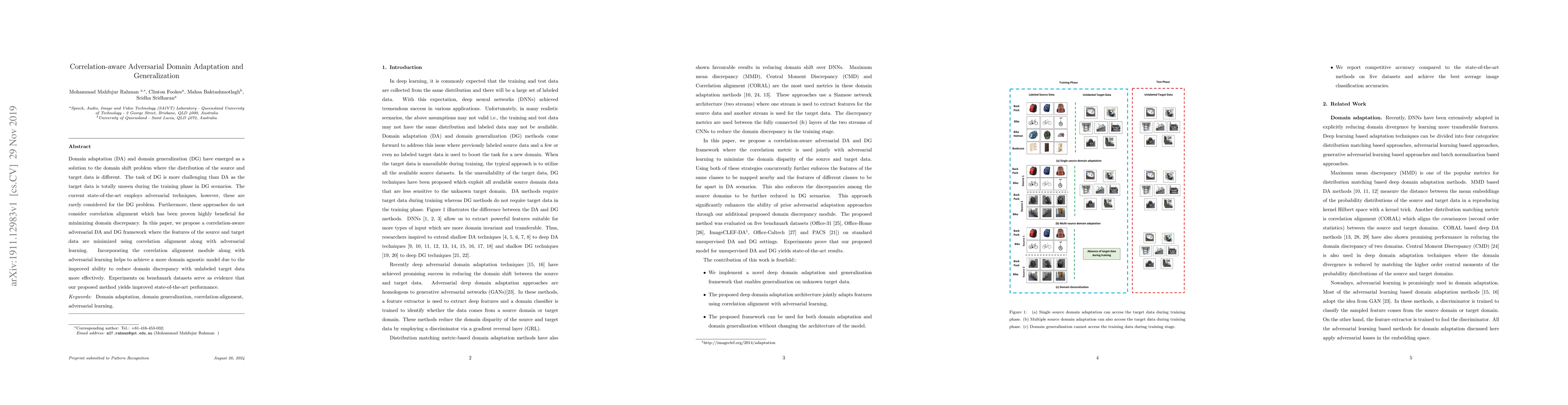 This paper proposes a novel correlation-aware adversarial domain adaptation and generalization framework that combines correlation alignment with adversarial learning to minimize domain discrepancy. The method achieves superior performance in domain generalization tasks, as evidenced by experiments on benchmark datasets.