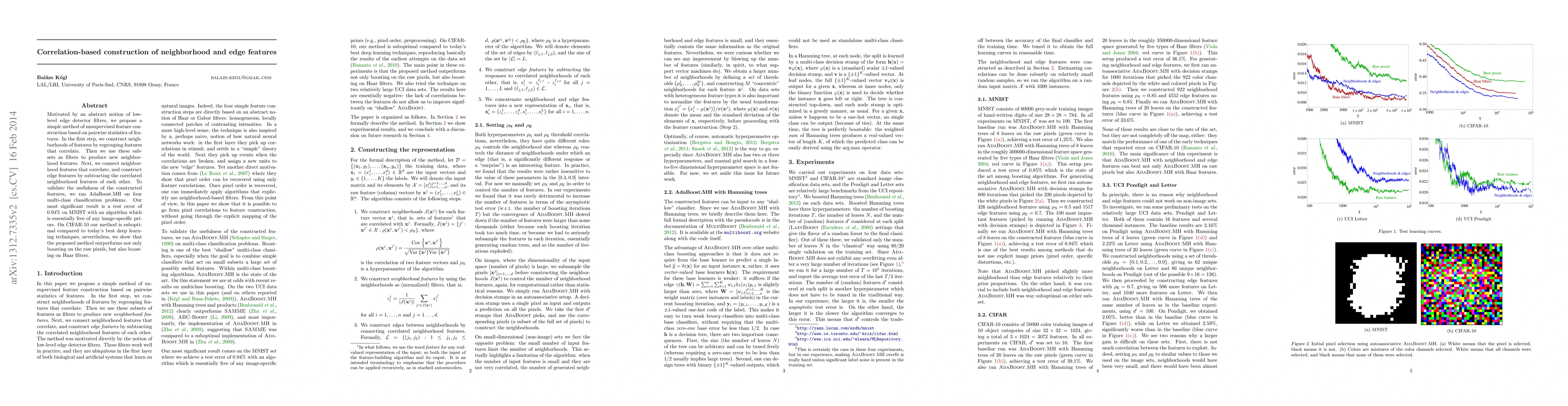 Motivated by an abstract notion of low-level edge detector filters, we propose a simple method of unsupervised feature construction based on pairwise statistics of features. In the first step, we construct neighborhoods of features by regrouping features that correlate. Then we use these subsets as filters to produce new neighborhood features. Next, we connect neighborhood features that correlate, and construct edge features by subtracting the correlated neighborhood features of each other. To validate the usefulness of the constructed features, we ran AdaBoost.MH on four multi-class classification problems. Our most significant result is a test error of 0.94% on MNIST with an algorithm which is essentially free of any image-specific priors. On CIFAR-10 our method is suboptimal compared to today's best deep learning techniques, nevertheless, we show that the proposed method outperforms not only boosting on the raw pixels, but also boosting on Haar filters.