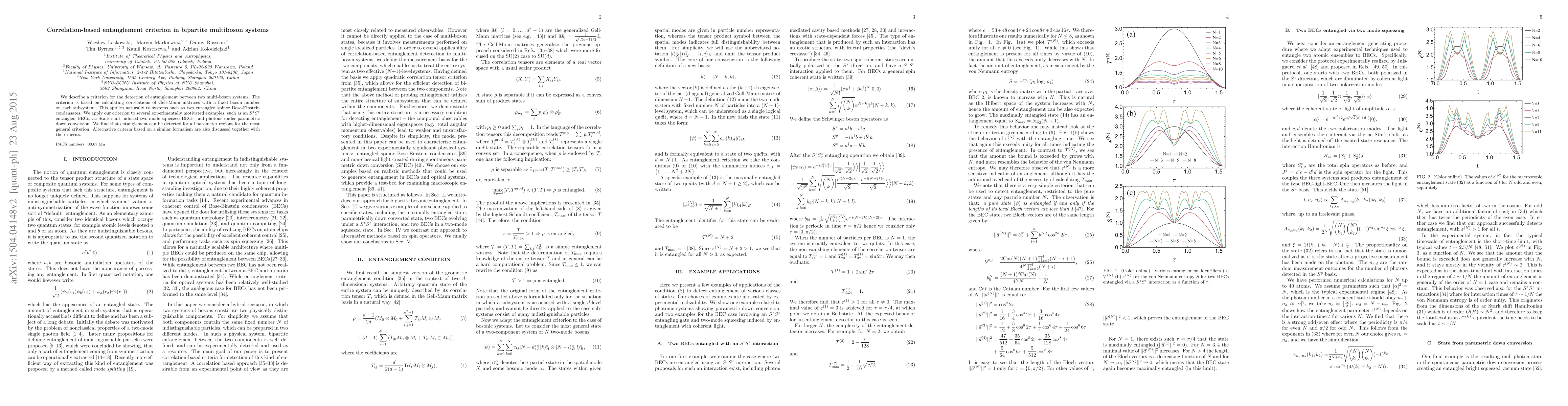 This paper proposes a new correlation-based criterion for detecting entanglement in bipartite multiboson systems using Gell-Mann matrix correlations. The method is tested on various examples, including entangled spinor Bose-Einstein condensates and photon systems, showing its effectiveness across different parameter regions.
