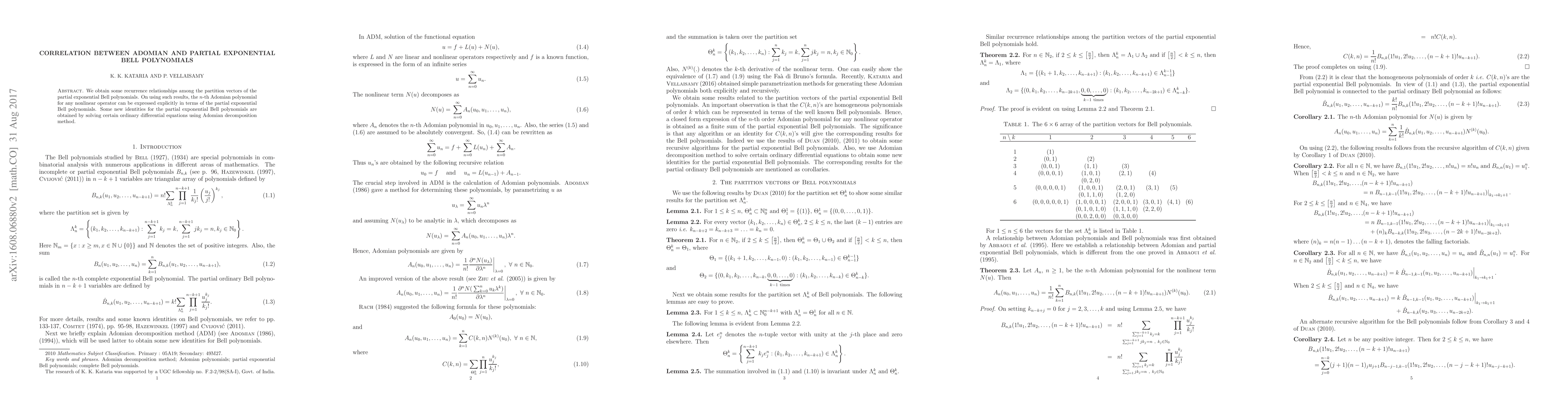 The paper establishes recurrence relationships among partition vectors of partial exponential Bell polynomials and expresses the $n$-th Adomian polynomial for nonlinear operators explicitly via these polynomials, also deriving new identities through the Adomian decomposition method.