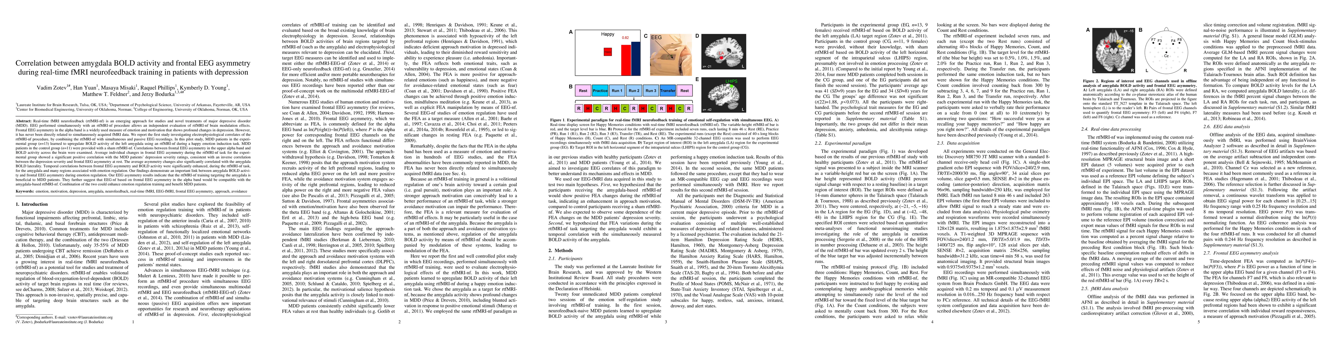 This study investigates the correlation between real-time fMRI neurofeedback-induced changes in left amygdala activity and frontal EEG asymmetry in patients with major depressive disorder (MDD). Results show that enhanced frontal EEG asymmetry during neurofeedback training correlates with reduced depression severity, suggesting that combining fMRI and EEG neurofeedback may improve emotion regulation in MDD patients.