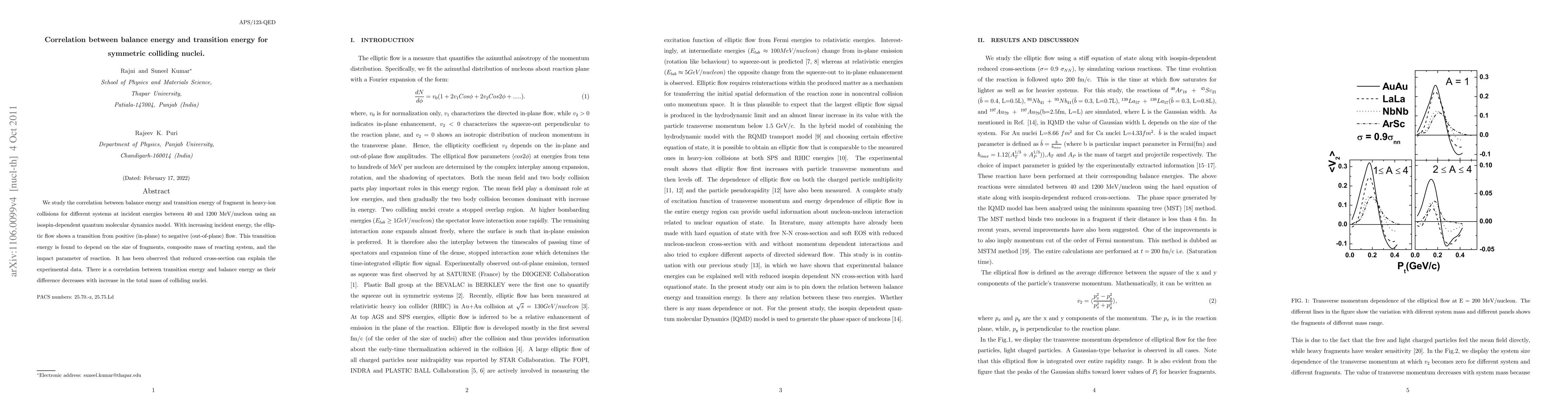 We study the correlation between balance energy and transition energy of fragment in heavy-ion collisions for different systems at incident energies between 40 and 1200 MeV/nucleon using an isospin-dependent quantum molecular dynamics model. With increasing incident energy, the elliptic flow shows a transition from positive (in-plane) to negative (out-of-plane) flow. This transition energy is found to depend on the size of fragments, composite mass of reacting system, and the impact parameter of reaction. It has been observed that reduced cross-section can explain the experimental data. There is a correlation between transition energy and balance energy as their difference decreases with increase in the total mass of colliding nuclei.