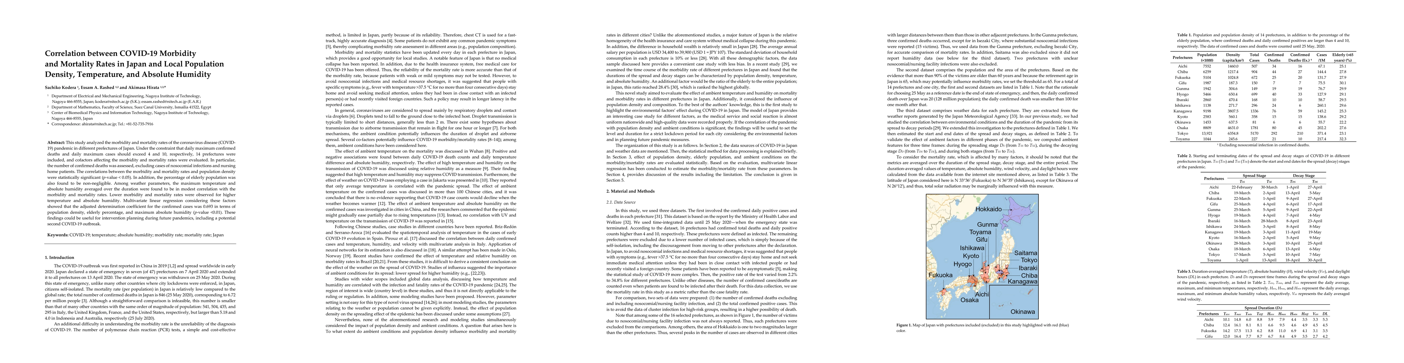 This study correlates COVID-19 morbidity and mortality rates in Japan's 14 prefectures with population density, temperature, and humidity, finding a mild link to density and modest correlations with weather factors. Multivariate analysis indicates these factors explain a significant portion of the pandemic's spread and decay.