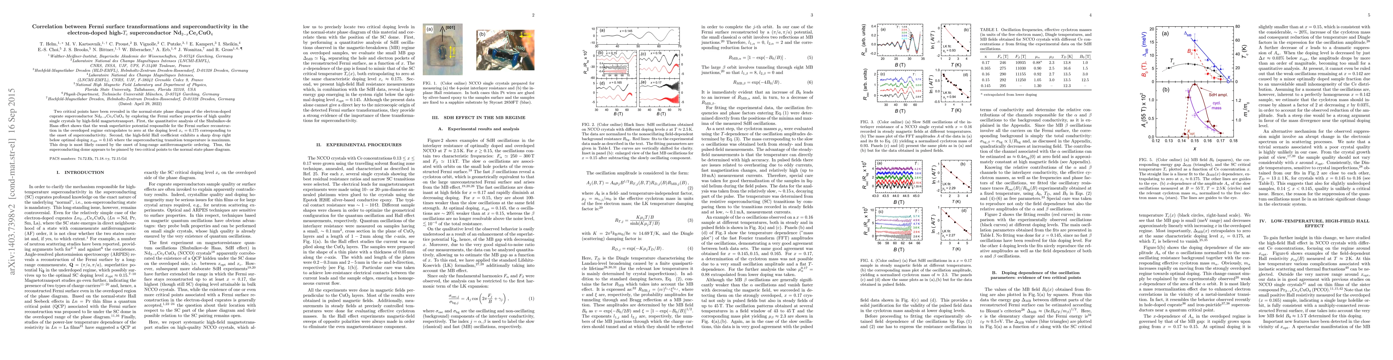 This study reveals two critical points in the electron-doped cuprate Nd$_{2-x}$Ce$_x$CuO$_4$ that correlate with superconductivity. The Fermi surface reconstruction vanishes at $x_c = 0.175$, marking the onset of superconductivity, while a sharp drop in the Hall coefficient below $x_{\mathrm{opt}} = 0.145$ suggests the influence of antiferromagnetic ordering.