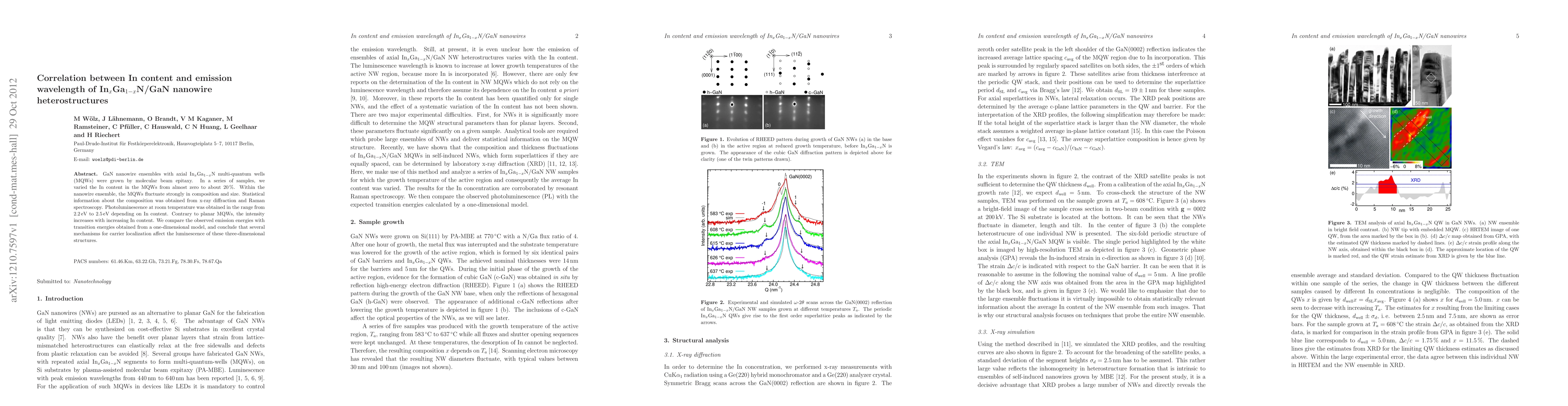 This study investigates GaN nanowire ensembles with InGaN multi-quantum wells grown by molecular beam epitaxy, finding that photoluminescence intensity increases with higher In content. The emission wavelength varies from 2.2 eV to 2.5 eV, and the observed luminescence is influenced by carrier localization mechanisms in the three-dimensional nanowire structures.