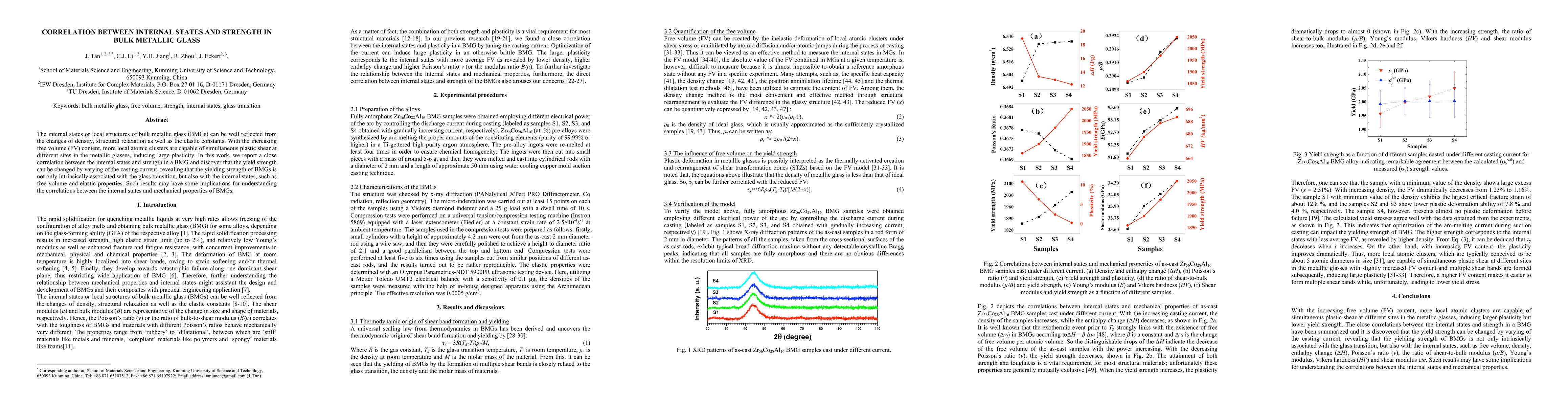 This study investigates the relationship between internal states and strength in bulk metallic glass (BMGs), revealing that yield strength correlates with factors like free volume and elastic properties. The research demonstrates that casting current can modify these internal states, suggesting a link between internal structure and mechanical strength in BMGs.