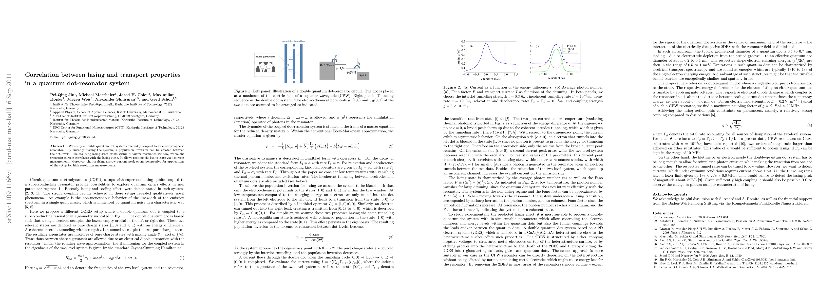 This paper explores a quantum dot-resonator system where lasing correlates with transport properties, revealing a narrow resonance window where a current peak indicates the lasing state, suggesting potential for high-resolution measurement applications.