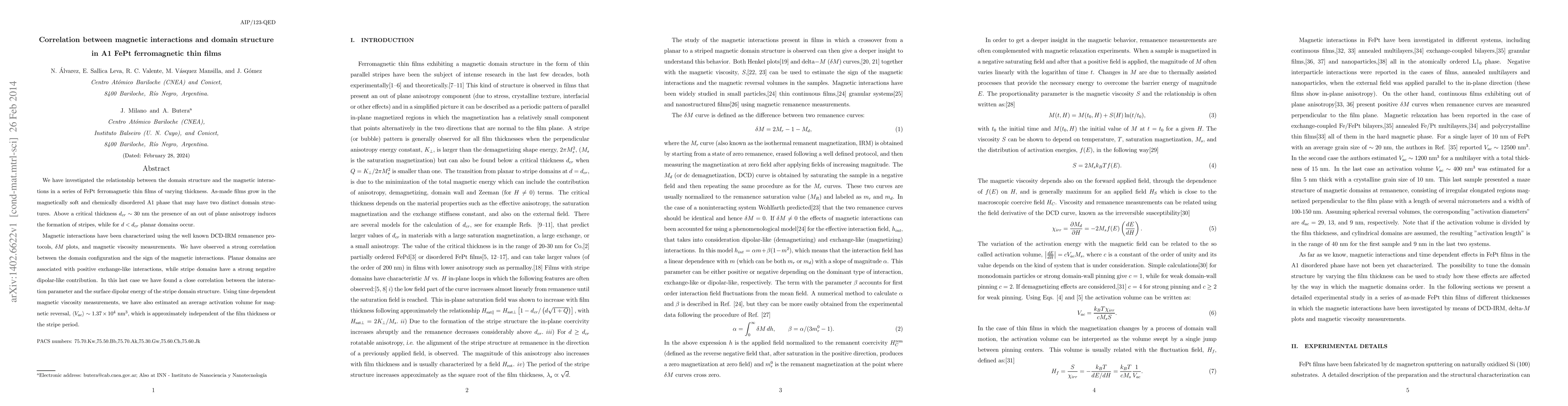 This study investigates the relationship between domain structure and magnetic interactions in FePt ferromagnetic thin films, finding that planar domains correlate with positive exchange-like interactions, while stripe domains exhibit strong negative dipolar-like interactions. The research also estimates an average activation volume for magnetic reversal, independent of film thickness.