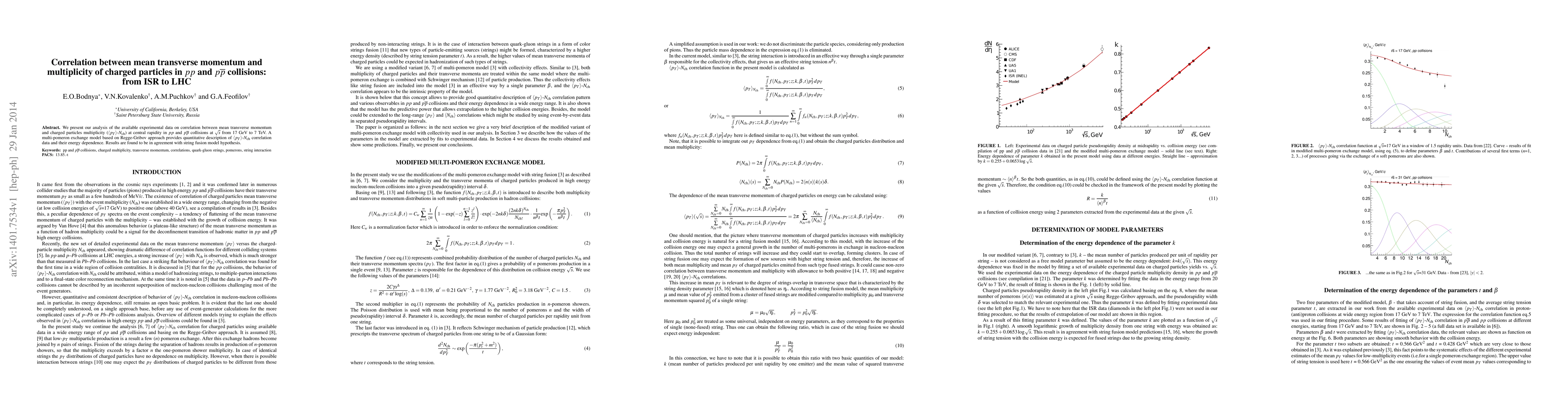 This paper analyzes the correlation between mean transverse momentum and charged particle multiplicity in $pp$ and $p\bar{p}$ collisions from ISR to LHC energies. A multi-pomeron exchange model based on the Regge-Gribov approach quantitatively describes these correlations, aligning with the string fusion model hypothesis.