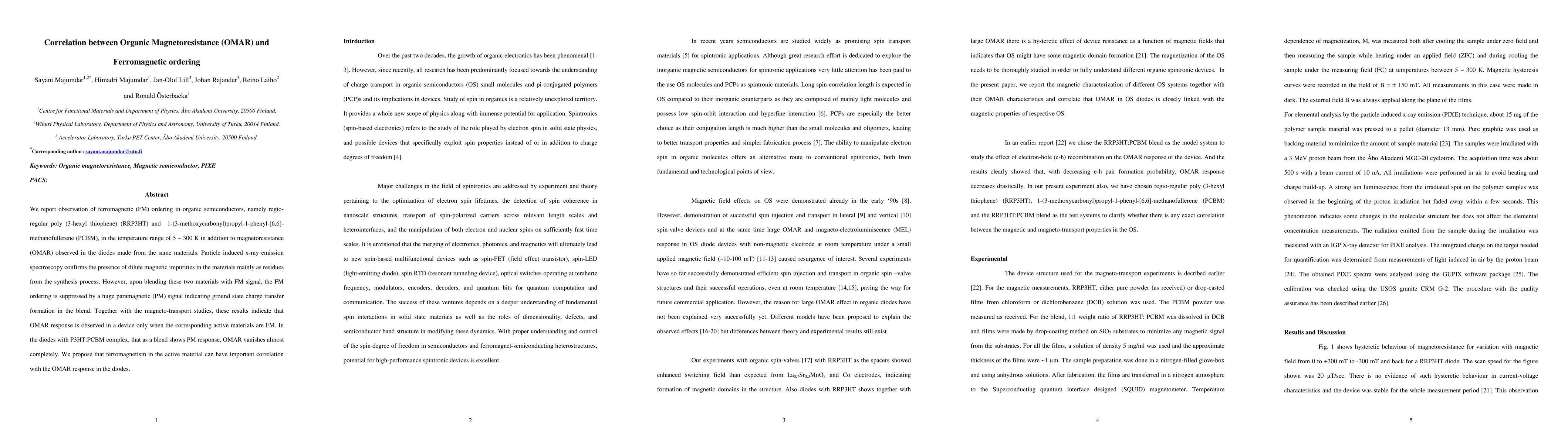 This paper observes ferromagnetic ordering in organic semiconductors like RRP3HT and PCBM, alongside organic magnetoresistance (OMAR) in related diodes. It finds that OMAR is only present when the active materials exhibit ferromagnetism, suggesting a strong correlation between the two phenomena.