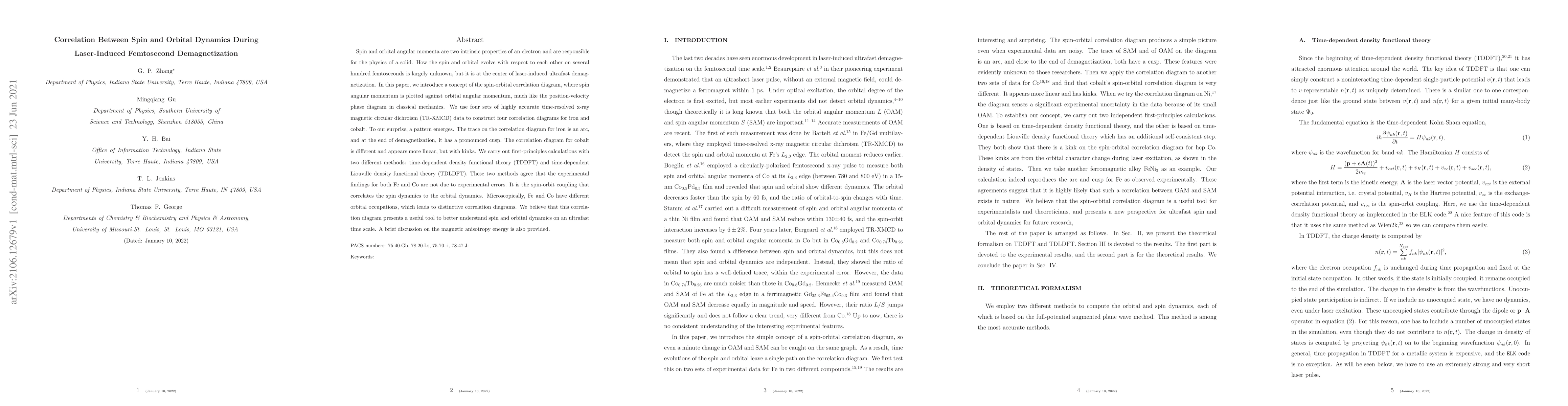 Spin and orbital angular momenta are two intrinsic properties of an electron and are responsible for the physics of a solid. How the spin and orbital evolve with respect to each other on several hundred femtoseconds is largely unknown, but it is at the center of laser-induced ultrafast demagnetization. In this paper, we introduce a concept of the spin-orbital correlation diagram, where spin angular momentum is plotted against orbital angular momentum, much like the position-velocity phase diagram in classical mechanics. We use four sets of highly accurate time-resolved x-ray magnetic circular dichroism (TR-XMCD) data to construct four correlation diagrams for iron and cobalt. To our surprise, a pattern emerges. The trace on the correlation diagram for iron is an arc, and at the end of demagnetization, it has a pronounced cusp. The correlation diagram for cobalt is different and appears more linear, but with kinks. We carry out first-principles calculations with two different methods: time-dependent density functional theory (TDDFT) and time-dependent Liouville density functional theory (TDLDFT). These two methods agree that the experimental findings for both Fe and Co are not due t experimental errors. It is the spin-orbit coupling that correlates the spin dynamics to the orbital dynamics.Microscopically, Fe and Co have different orbital occupations, which leads to distinctive correlation diagrams. We believe that this correlation diagram presents a useful tool to better understand spin and orbital dynamics on an ultrafast time scale. A brief discussion on the magnetic anisotropy energy is also provided.