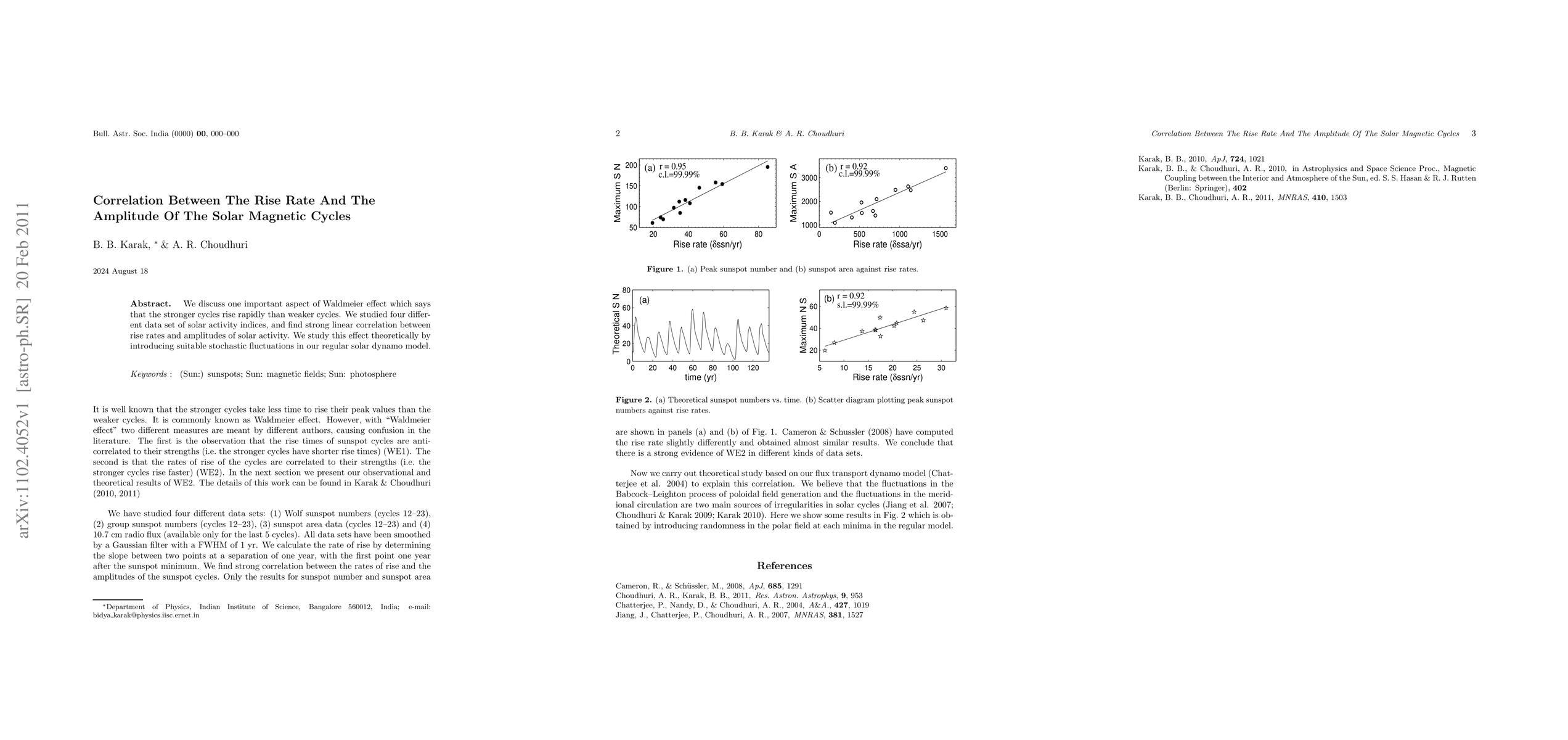 Summary: The study investigates the Waldmeier effect, finding a strong linear correlation between the rise rate and amplitude of solar magnetic cycles using four solar activity datasets. Theoretical modeling with stochastic fluctuations supports these empirical findings.