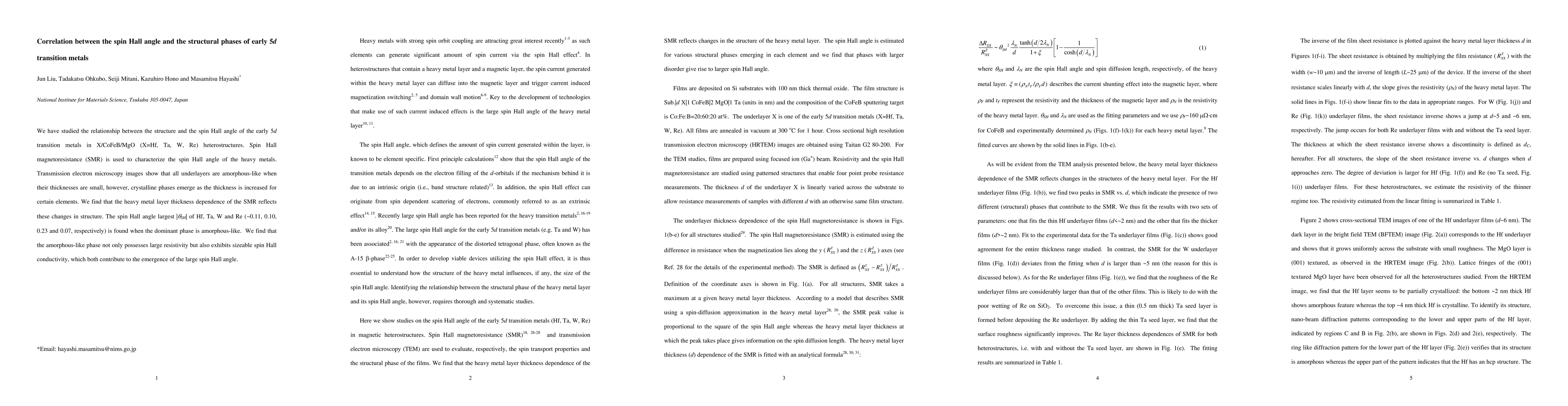 This study investigates the correlation between structural phases and spin Hall angle in early 5d transition metals (Hf, Ta, W, Re) in X/CoFeB/MgO heterostructures, finding that the largest spin Hall angle occurs in the amorphous-like phase due to high resistivity and spin Hall conductivity. The transition to crystalline phases with increased thickness alters the spin Hall angle.