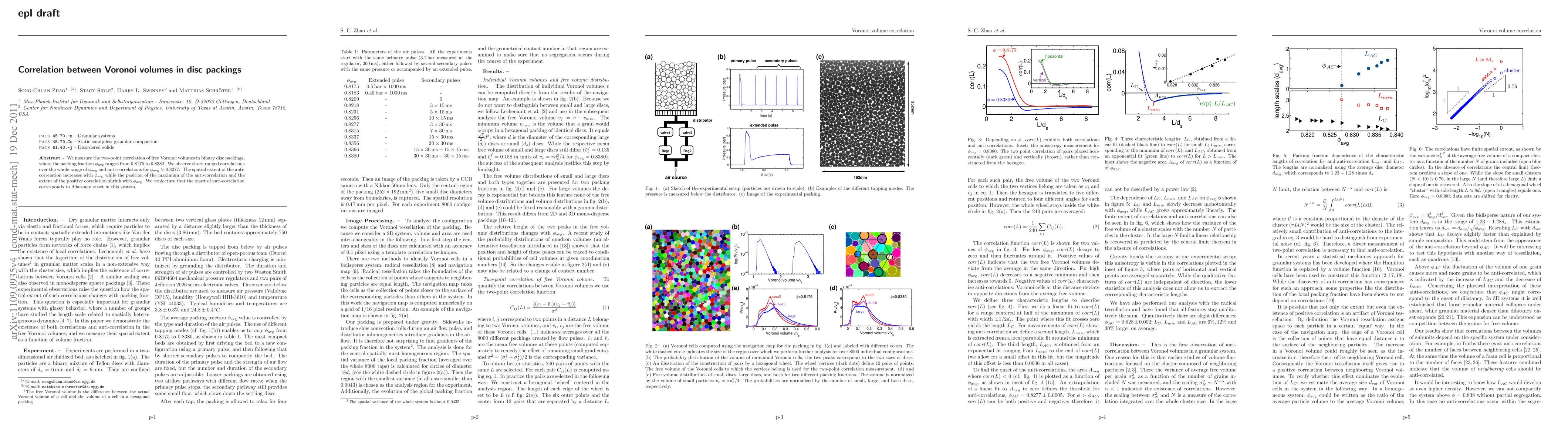 This study investigates the two-point correlation of Voronoi volumes in binary disc packings, finding short-ranged correlations and anti-correlations for packing fractions above 0.8277. The anti-correlation's spatial extent grows with increasing packing fraction, while the positive correlation diminishes.