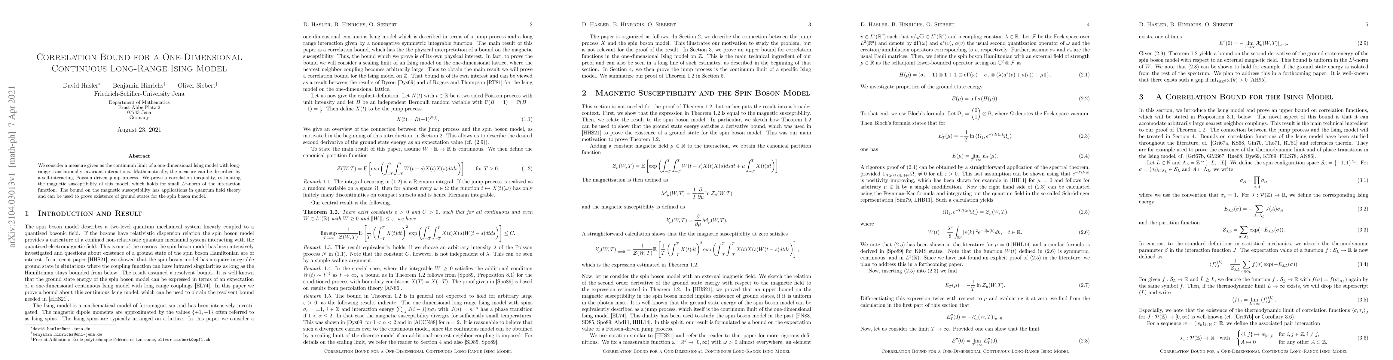 This paper proves a correlation inequality for a one-dimensional long-range Ising model, estimating its magnetic susceptibility under small $L^1$-norm conditions. The result has implications for quantum field theory and aids in proving the existence of ground states in the spin boson model.