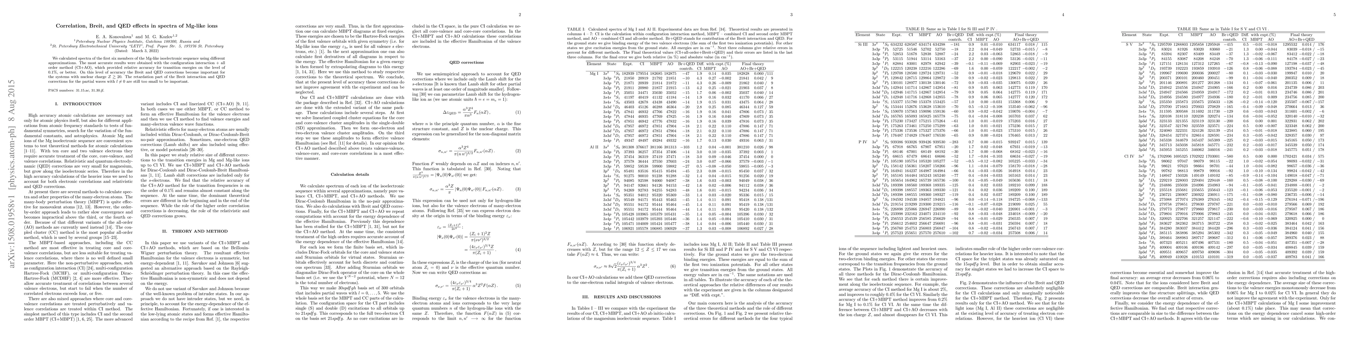 We calculated spectra of the first six members of the Mg-like isoelectronic sequence using different approximations. The most accurate results were obtained with the configuration interaction + all order method (CI+AO), which provided relative accuracy for transition energies on the level of 0.1\%, or better. On this level of accuracy the Breit and QED corrections become important for the systems with nuclear charge $Z\gtrsim 20$. The retardation part of the Breit interaction and QED corrections for the partial waves with $l\ne 0$ are still too small to be important.