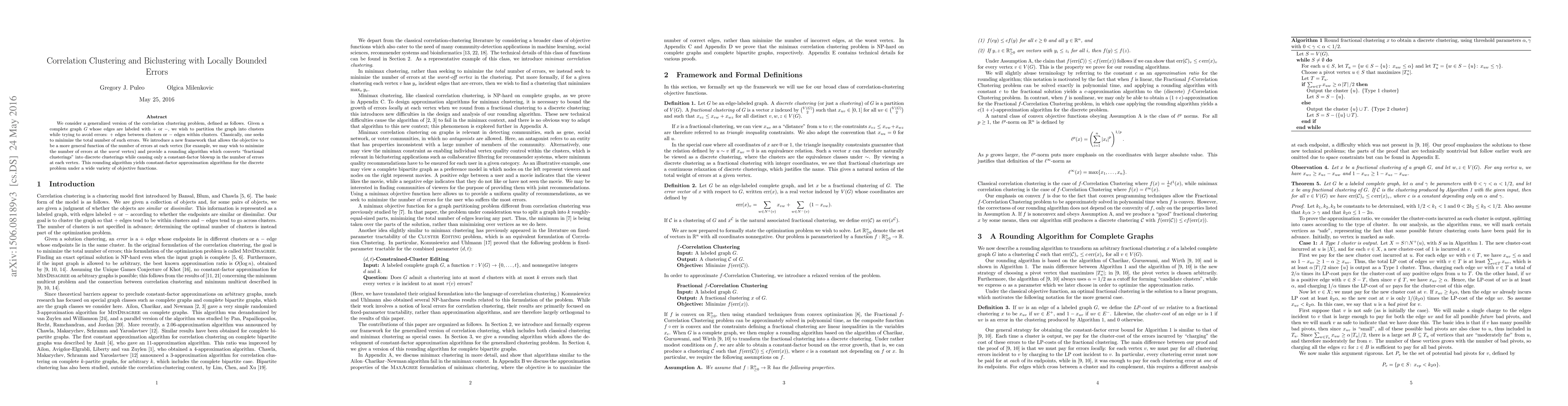 This research introduces a new framework for correlation clustering, allowing a broader objective function for error minimization at each vertex. A rounding algorithm is provided, ensuring a constant-factor increase in vertex error count, leading to constant-factor approximation solutions for various objective functions.