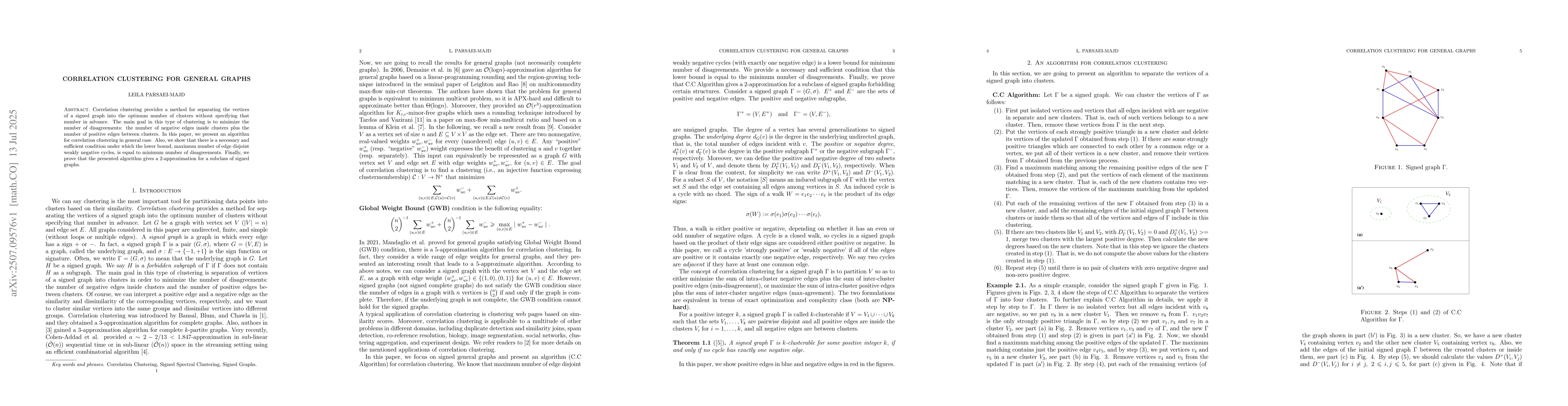 Correlation clustering provides a method for separating the vertices of a signed graph into the optimum number of clusters without specifying that number in advance. The main goal in this type of clustering is to minimize the number of disagreements: the number of negative edges inside clusters plus the number of positive edges between clusters. In this paper, we present an algorithm for correlation clustering in general case. Also, we show that there is a necessary and sufficient condition under which the lower bound, maximum number of edge disjoint weakly negative cycles, is equal to minimum number of disagreements. Finally, we prove that the presented algorithm gives a $2$-approximation for a subclass of signed graphs.