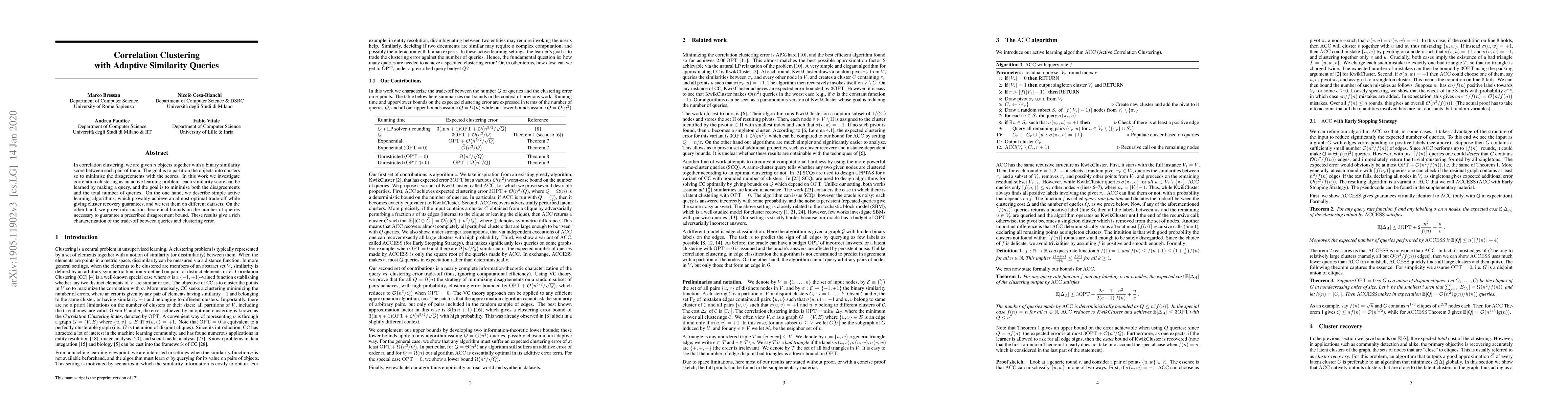 The paper investigates correlation clustering as an active learning problem, aiming to minimize both disagreements and the total number of queries. It presents simple active learning algorithms with provable trade-off guarantees and cluster recovery, tested on various datasets, alongside information-theoretic bounds on necessary queries for a given disagreement bound.