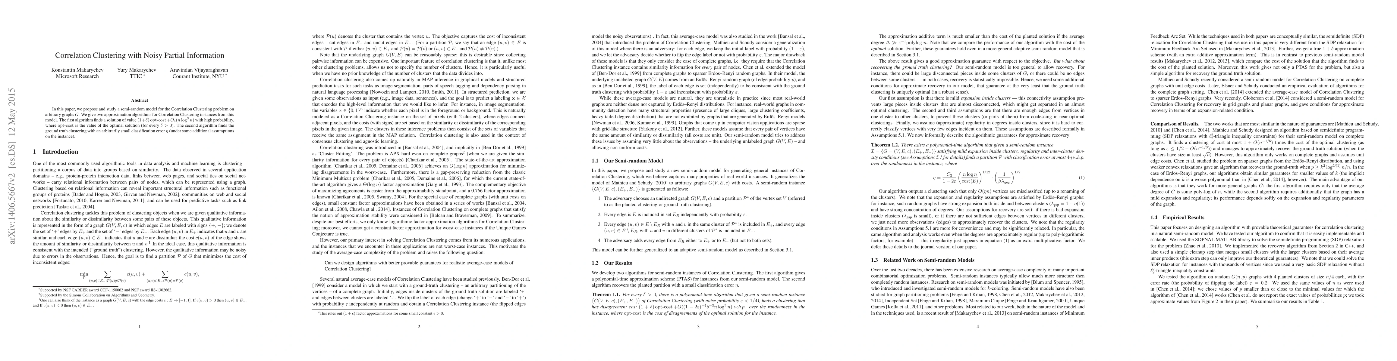 This paper proposes a semi-random model for Correlation Clustering on arbitrary graphs, providing two approximation algorithms with guaranteed performance bounds.