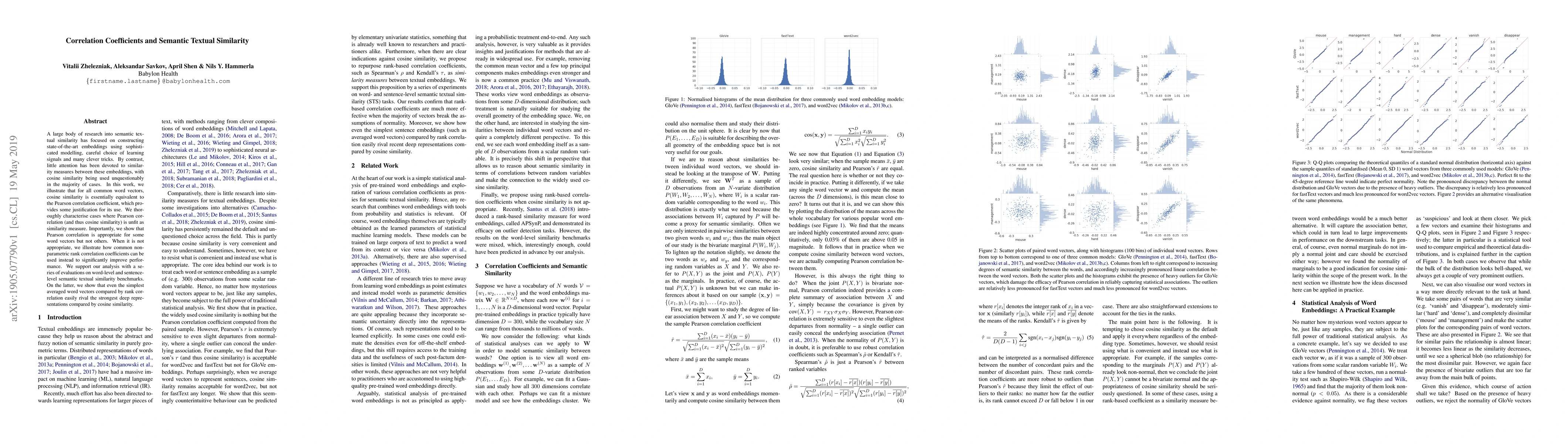 The research investigates statistical correlation coefficients as measures for semantic textual similarity, comparing cosine similarity with Pearson correlation. It analyzes word vectors from GloVe, fastText, and word2vec, characterizing when Pearson correlation is inappropriate and demonstrating the effectiveness of rank correlation coefficients in improving performance.
