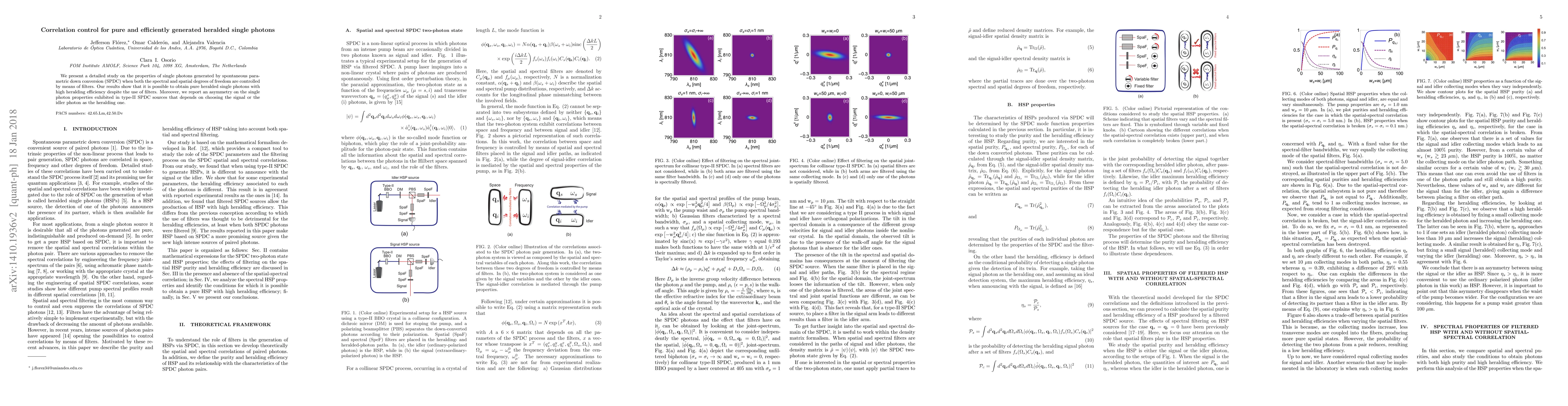 We present a detailed study on the properties of single photons generated by spontaneous parametric down conversion (SPDC) when both the spectral and spatial degrees of freedom are controlled by means of filters. Our results show that it is possible to obtain pure heralded single photons with high heralding efficiency despite the use of filters. Moreover, we report an asymmetry on the single photon properties exhibited in type-II SPDC sources that depends on choosing the signal or the idler photon as the heralding one.