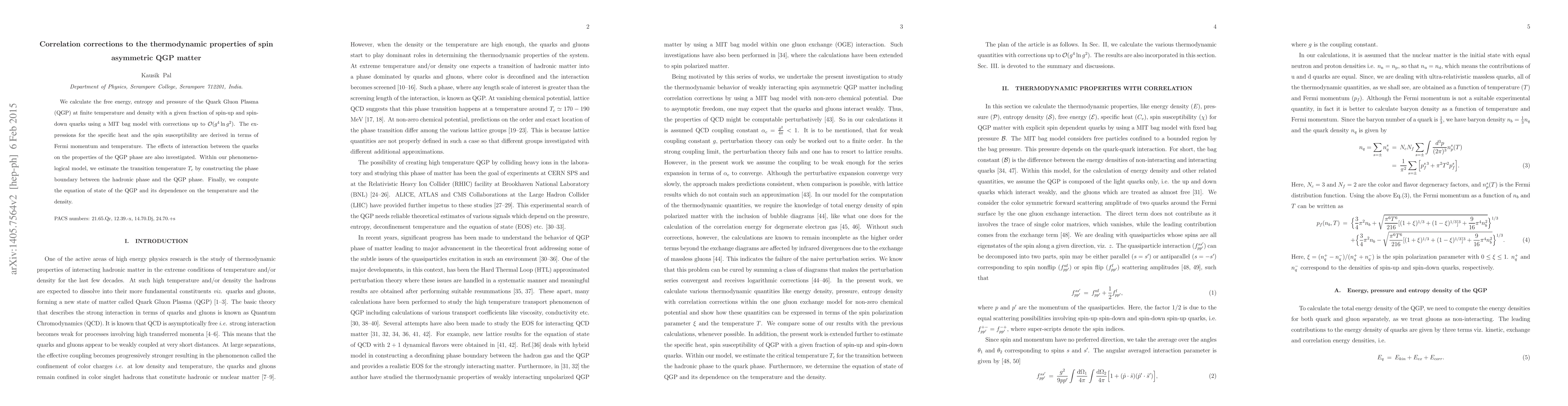 We calculate the free energy, entropy and pressure of the Quark Gluon Plasma (QGP) at finite temperature and density with a given fraction of spin-up and spin-down quarks using a MIT bag model with corrections up to ${\cal O} (g^4 \ln g^2)$. The expressions for the specific heat and the spin susceptibility are derived in terms of Fermi momentum and temperature. The effects of interaction between the quarks on the properties of the QGP phase are also investigated. Within our phenomenological model, we estimate the transition temperature $T_c$ by constructing the phase boundary between the hadronic phase and the QGP phase. Finally, we compute the equation of state of the QGP and its dependence on the temperature and the density.