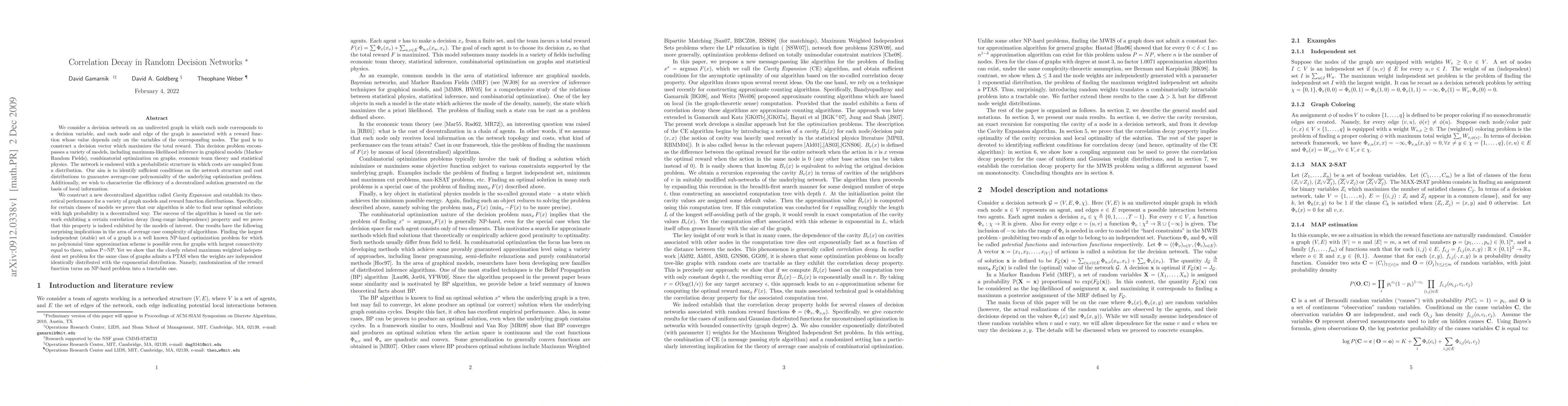 We consider a decision network on an undirected graph in which each node corresponds to a decision variable, and each node and edge of the graph is associated with a reward function whose value depends only on the variables of the corresponding nodes. The goal is to construct a decision vector which maximizes the total reward. This decision problem encompasses a variety of models, including maximum-likelihood inference in graphical models (Markov Random Fields), combinatorial optimization on graphs, economic team theory and statistical physics. The network is endowed with a probabilistic structure in which costs are sampled from a distribution. Our aim is to identify sufficient conditions to guarantee average-case polynomiality of the underlying optimization problem. We construct a new decentralized algorithm called Cavity Expansion and establish its theoretical performance for a variety of models. Specifically, for certain classes of models we prove that our algorithm is able to find near optimal solutions with high probability in a decentralized way. The success of the algorithm is based on the network exhibiting a correlation decay (long-range independence) property. Our results have the following surprising implications in the area of average case complexity of algorithms. Finding the largest independent (stable) set of a graph is a well known NP-hard optimization problem for which no polynomial time approximation scheme is possible even for graphs with largest connectivity equal to three, unless P=NP. We show that the closely related maximum weighted independent set problem for the same class of graphs admits a PTAS when the weights are i.i.d. with the exponential distribution. Namely, randomization of the reward function turns an NP-hard problem into a tractable one.