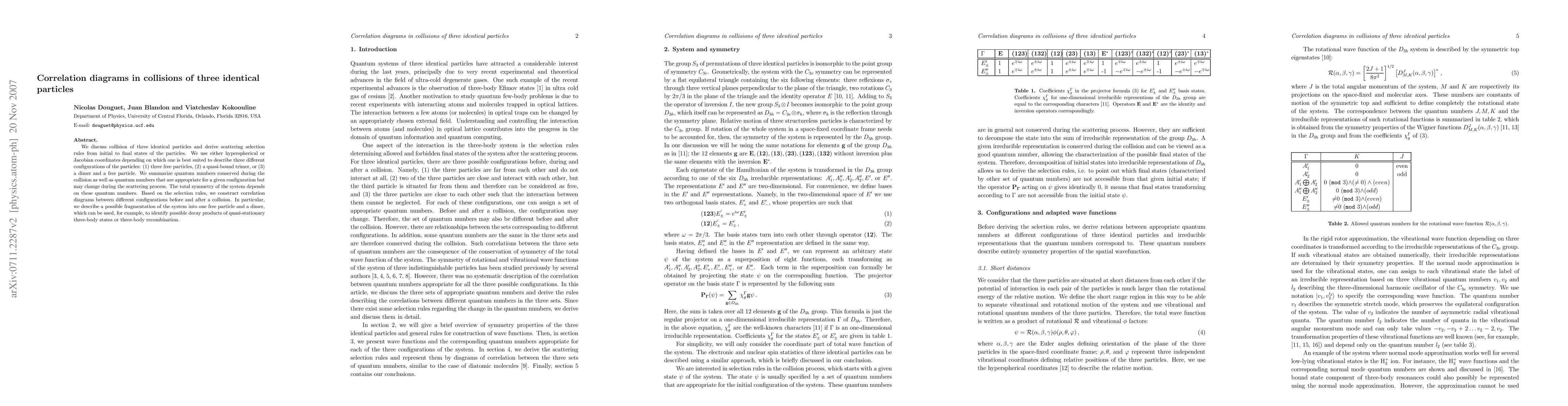This paper derives scattering selection rules for collisions of three identical particles and constructs correlation diagrams based on conserved quantum numbers, applicable to configurations like free particles, quasi-bound trimers, and a dimer with a free particle. It identifies possible recombinations post-collision, useful for identifying decay products of quasi-stationary three-body states.
