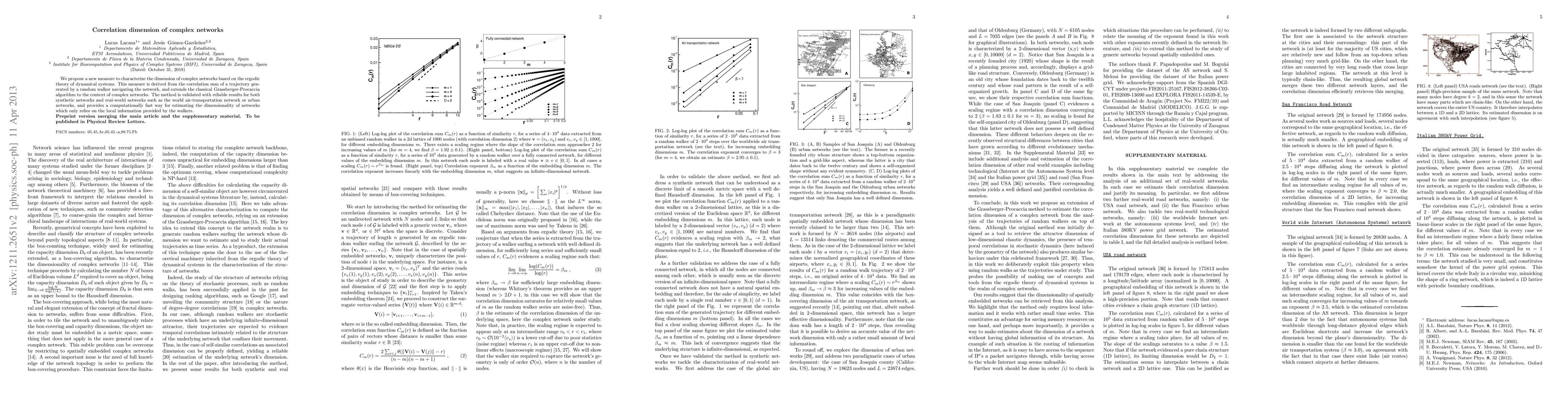 This paper introduces a novel measure for determining the dimension of complex networks using the correlation sum of a random walker's trajectory, extending the Grassberger-Procaccia algorithm. The method is validated on both synthetic and real-world networks, offering a fast, local-information-based approach for estimating network dimensionality.