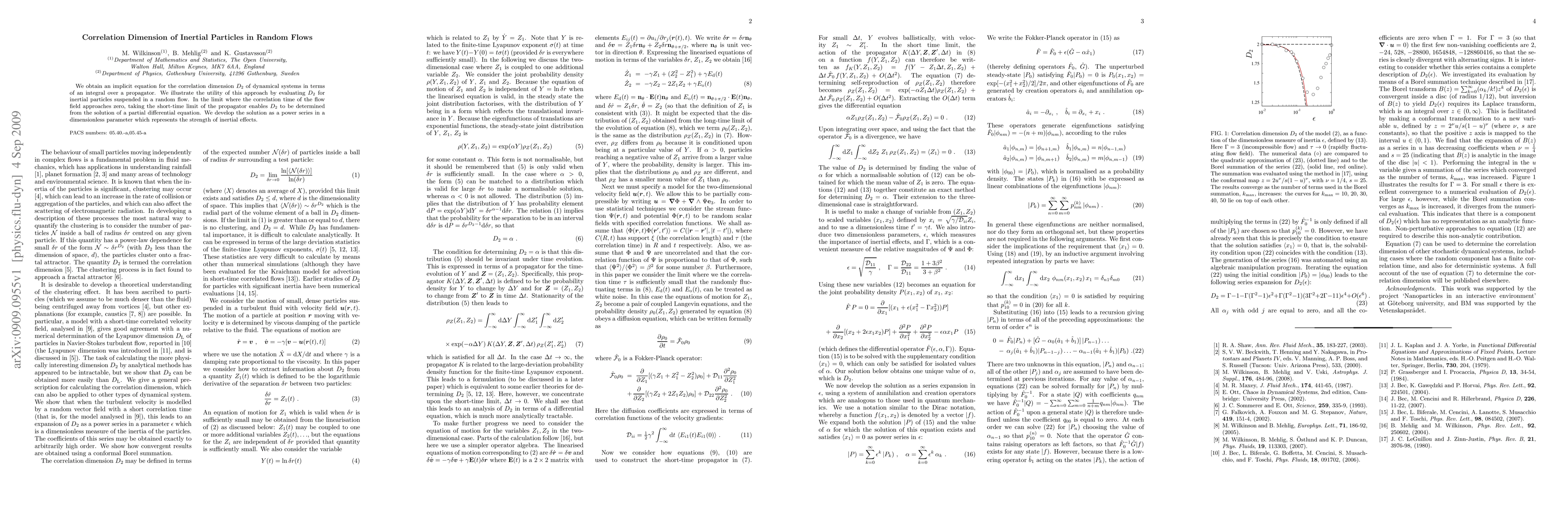 This paper derives an implicit equation for the correlation dimension of dynamical systems using an integral over a propagator and applies it to inertial particles in random flows, determining the correlation dimension through a partial differential equation in the short-time limit. The solution is expressed as a power series based on the strength of inertial effects.