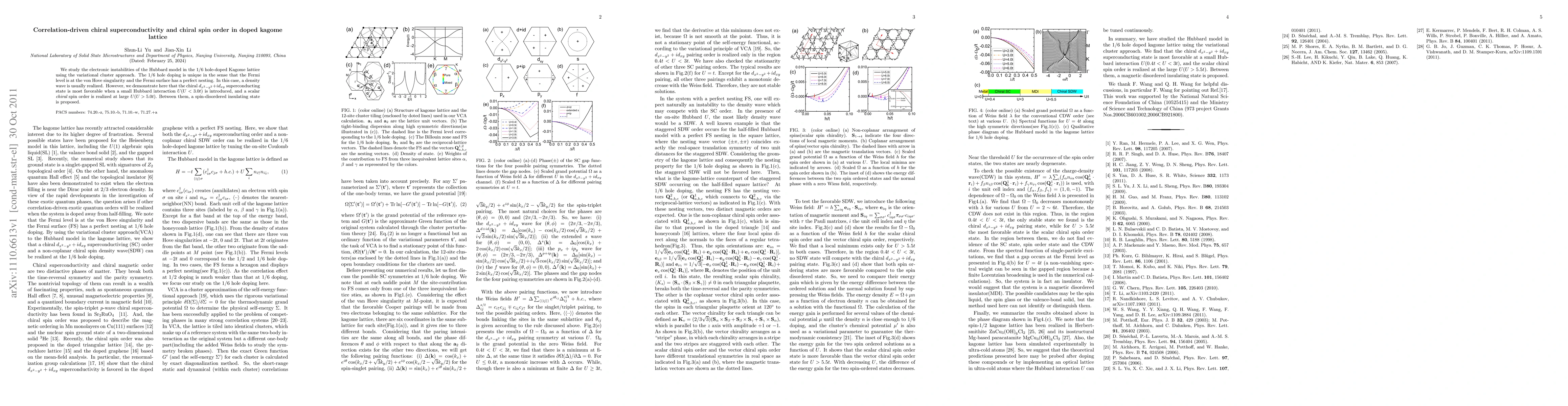 This paper investigates the electronic instabilities in the 1/6 hole-doped Kagome lattice using the variational cluster approach, revealing that a chiral $d_{x^{2}-y^{2}}+id_{xy}$ superconducting state emerges with small Hubbard interaction, while a scalar chiral spin order appears at larger interactions.