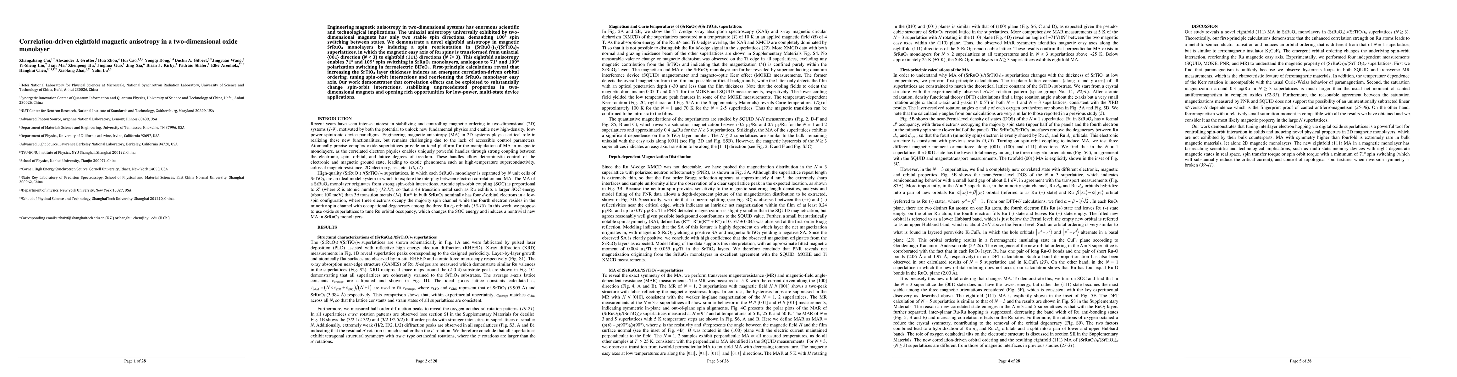 This paper demonstrates the engineering of eightfold magnetic anisotropy in SrRuO3 monolayers via spin reorientation in superlattices with varying SrTiO3 layer thicknesses, enabling 71 and 109 degrees spin switching. First-principles calculations show that correlation-driven orbital ordering induced by SrTiO3 layers tunes spin-orbit interactions, highlighting the potential for low-power, multi-state device applications.