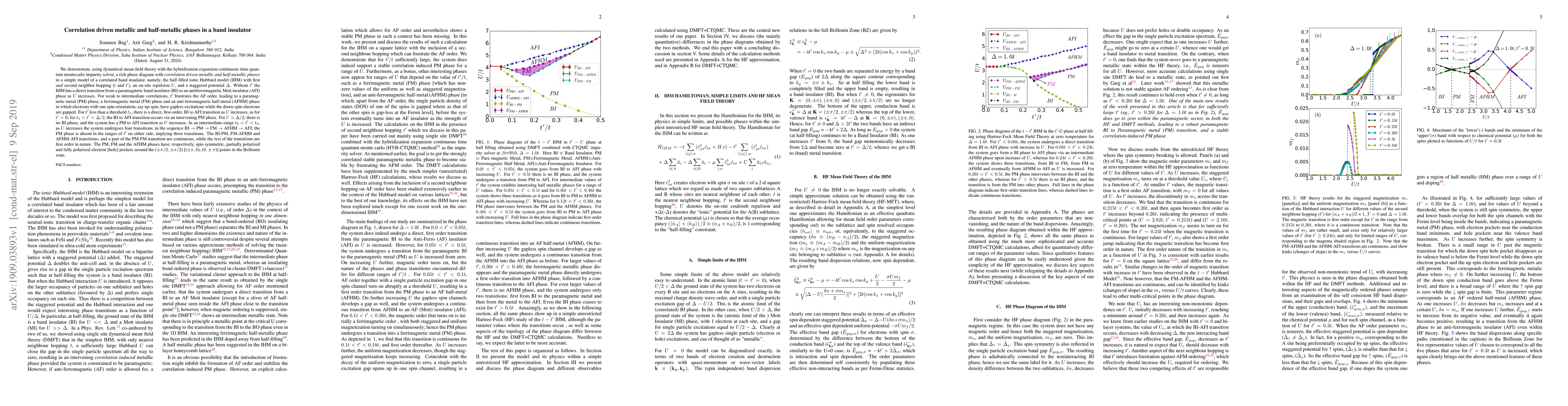 We demonstrate, using dynamical mean-field theory with the hybridization expansion continuous time quantum montecarlo impurity solver, a rich phase diagram with {\em correlation driven metallic and half-metallic phases} in a simple model of a correlated band insulator, namely, the half-filled ionic Hubbard model (IHM) with first {\em and} second neighbor hopping ($t$ and $t'$), an on-site repulsion $U$, and a staggered potential $\Delta$. Without $t'$ the IHM has a direct transition from a paramagnetic band insulator (BI) to an antiferromagnetic Mott insulator (AFI) phase as $U$ increases. For weak to intermediate correlations, $t'$ frustrates the AF order, leading to a paramagnetic metal (PM) phase, a ferrimagnetic metal (FM) phase and an anti-ferromagnetic half-metal (AFHM) phase in which electrons with one spin orientation, say up-spin, have gapless excitations while the down-spin electrons are gapped. For $t'$ less than a threshold $ t_1$, there is a direct, first-order, BI to AFI transition as $U$ increases, as for $t'=0$; for $t_4< t' < \Delta/2$, the BI to AFI transition occurs via an intervening PM phase. For $t' > \Delta/2$, there is no BI phase, and the system has a PM to AFI transition as $U$ increases. In an intermediate-range $t_2 < t' < t_3$, as $U$ increases the system undergoes four transitions, in the sequence BI $\rightarrow$ PM $\rightarrow$ FM $\rightarrow$ AFHM $\rightarrow$ AFI; the FM phase is absent in the ranges of $t'$ on either side, implying three transitions. The BI-PM, FM-AFHM and AFHM-AFI transitions, and a part of the PM-FM transition are continuous, while the rest of the transitions are first order in nature. The PM, FM and the AFHM phases have, respectively, spin symmetric, partially polarized and fully polarized electron [hole] pockets around the ($\pm\pi/2$, $\pm\pi/2$) [($\pm \pi, 0$), ($0. \pm \pi$)] points in the Brillouin zone.