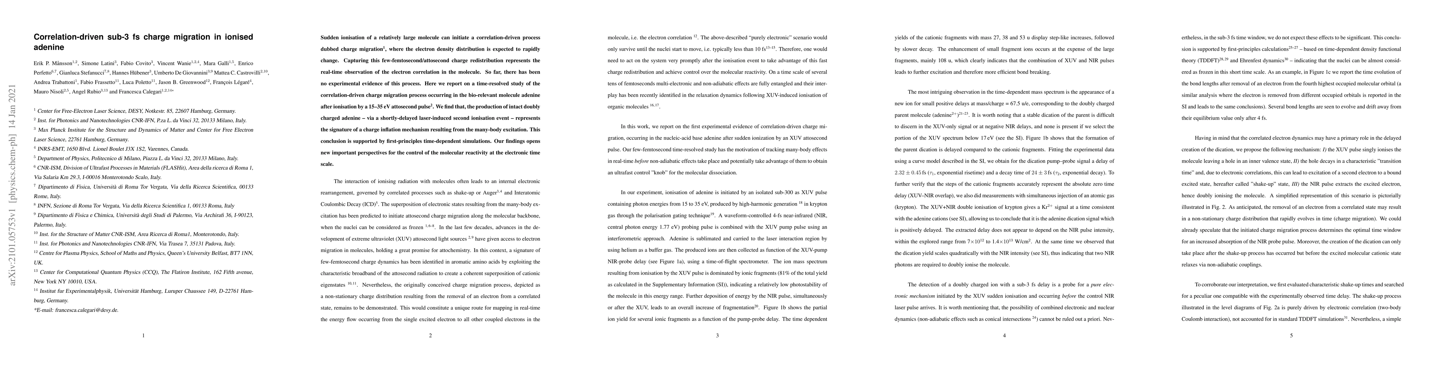 Sudden ionisation of a relatively large molecule can initiate a correlation-driven process dubbed charge migration, where the electron density distribution is expected to rapidly change. Capturing this few-femtosecond/attosecond charge redistribution represents the real-time observation of the electron correlation in the molecule. So far, there has been no experimental evidence of this process. Here we report on a time-resolved study of the correlation-driven charge migration process occurring in the bio-relevant molecule adenine after ionisation by a 15-35 eV attosecond pulse . We find that, the production of intact doubly charged adenine - via a shortly-delayed laser-induced second ionisation event - represents the signature of a charge inflation mechanism resulting from the many-body excitation. This conclusion is supported by first-principles time-dependent simulations. Our findings opens new important perspectives for the control of the molecular reactivity at the electronic timescale.