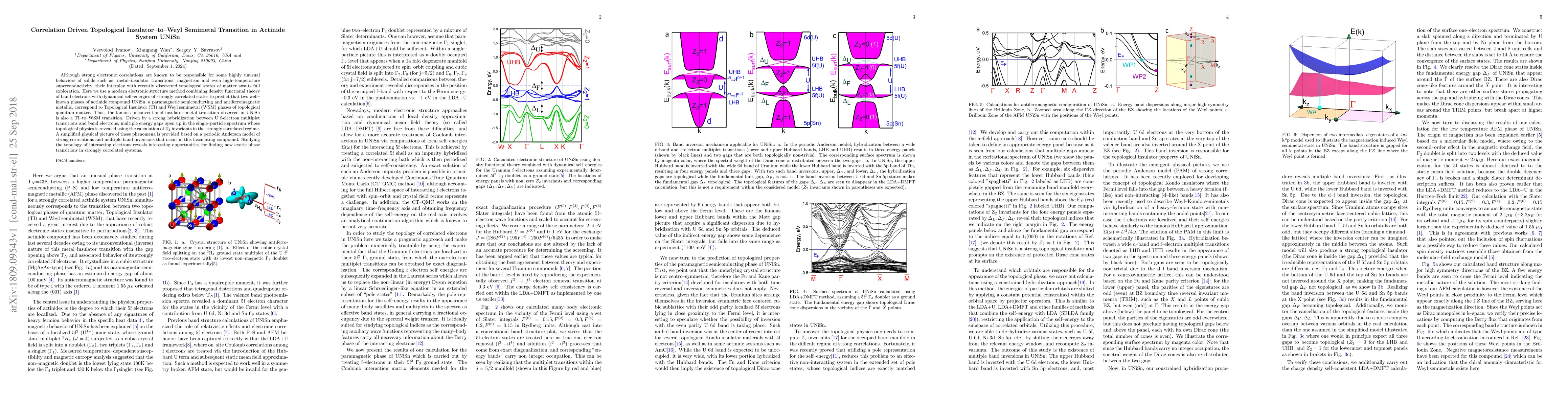 This paper predicts that the phase transition in the actinide compound UNiSn from a paramagnetic semiconductor to an antiferromagnetic metal is a topological insulator-to-Weyl semimetal transition, driven by strong electronic correlations and hybridization between U f-electrons and band electrons. The study uses advanced electronic structure methods to explore the topological properties of this transition.