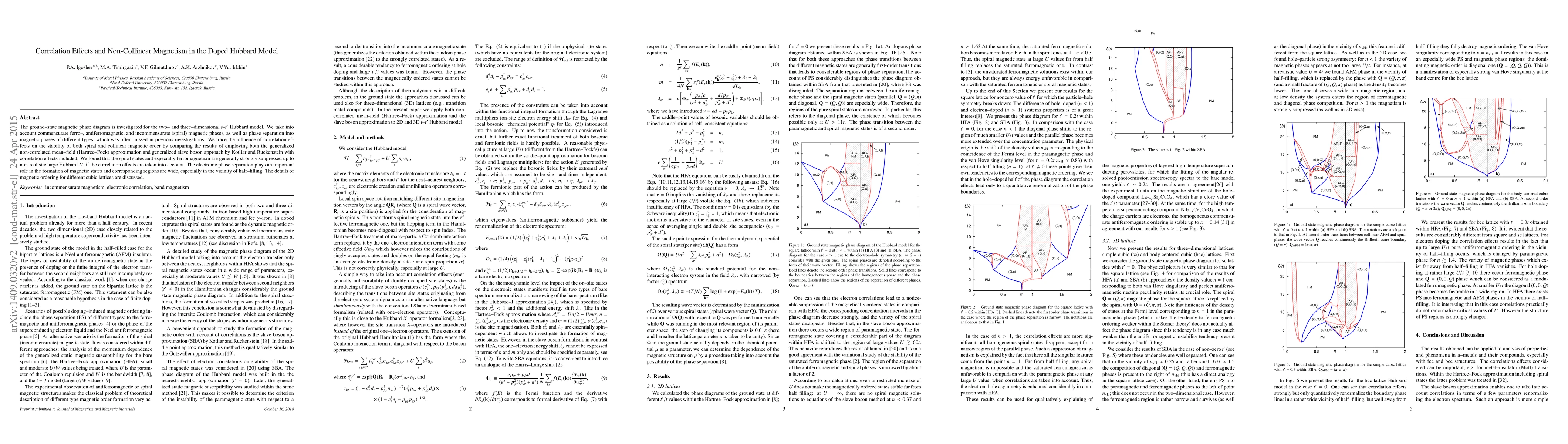 This paper investigates the magnetic phase diagram of the doped Hubbard model, focusing on the effects of correlation and phase separation on the stability of spiral and collinear magnetic orders. It finds that correlation effects strongly suppress spiral states and ferromagnetism, with electronic phase separation significantly influencing magnetic state formation, especially near half-filling.