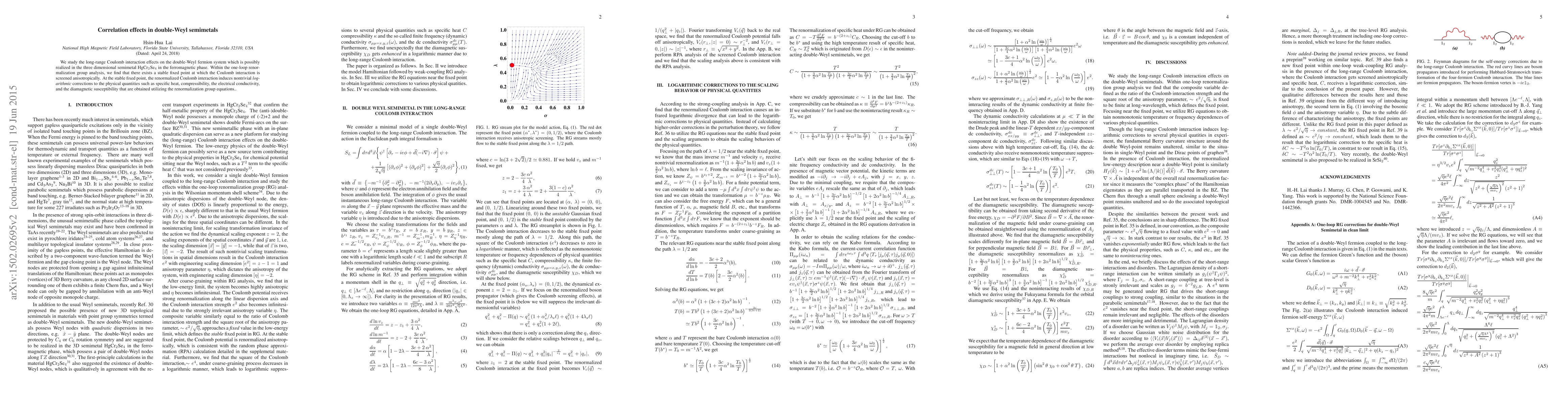 We study the long-range Coulomb interaction effects on the double-Weyl fermion system which is possibly realized in the three dimensional semimetal HgCr$_2$Se$_4$ in the ferromagnetic phase. Within the one-loop renormalization group analysis, we find that there exists a stable fixed point at which the Coulomb interaction is screened anisotropically. At the stable fixed point, the renormalized Coulomb interaction induces logarithmic corrections to the physical quantities such as specific heat, compressibility, diamagnetic susceptibility, and the finite frequency (dynamic) conductivity that are obtained utilizing RG equations near the stable fixed point.