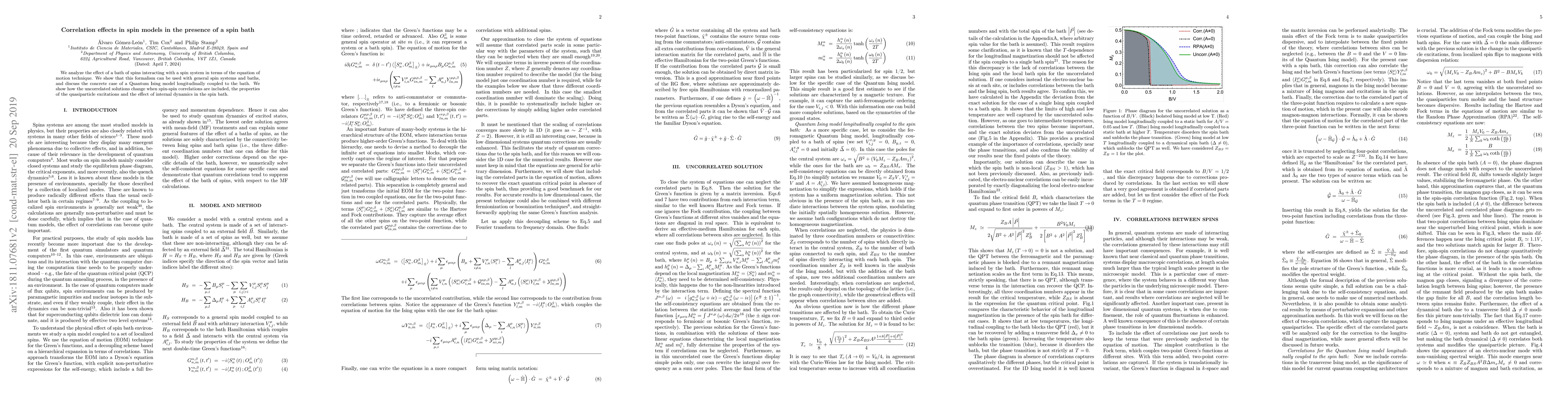 This paper analyzes the effect of a bath of spins on a spin system using the equation of motion technique, focusing on the impact of spin-spin correlations on quasiparticle excitations and internal dynamics in the bath.