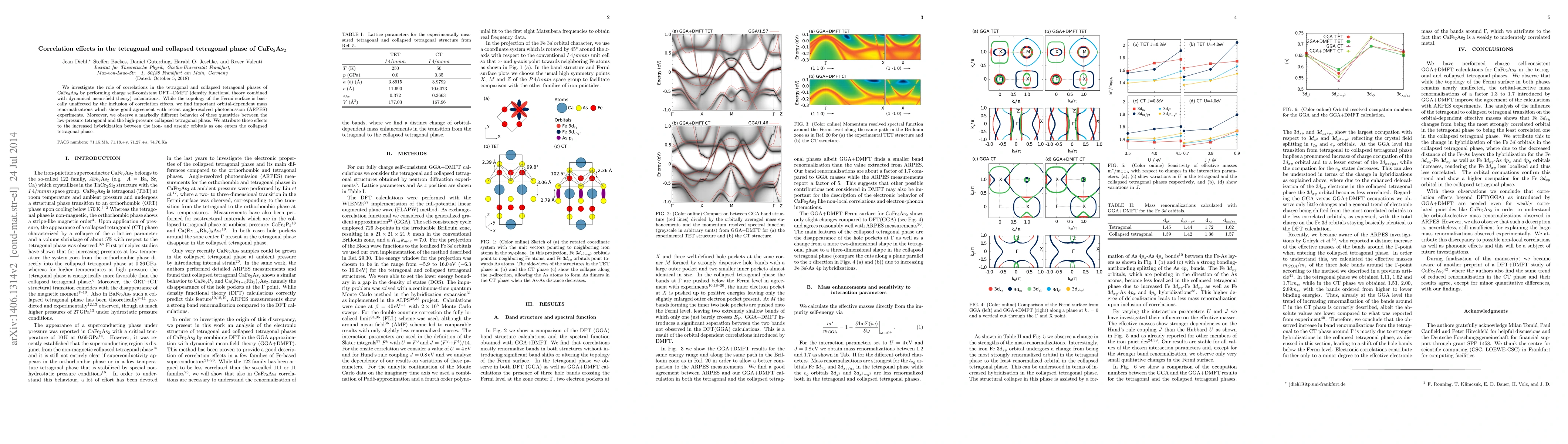 We investigate the role of correlations in the tetragonal and collapsed tetragonal phases of CaFe2As2 by performing charge self-consistent DFT+DMFT (density functional theory combined with dynamical mean-field theory) calculations. While the topology of the Fermi surface is basically unaffected by the inclusion of correlation effects, we find important orbital-dependent mass renormalizations which show good agreement with recent angle-resolved photoemission (ARPES) experiments. Moreover, we observe a markedly different behavior of these quantities between the low-pressure tetragonal and the high-pressure collapsed tetragonal phase. We attribute these effects to the increased hybridization between the iron- and arsenic orbitals as one enters the collapsed tetragonal phase.