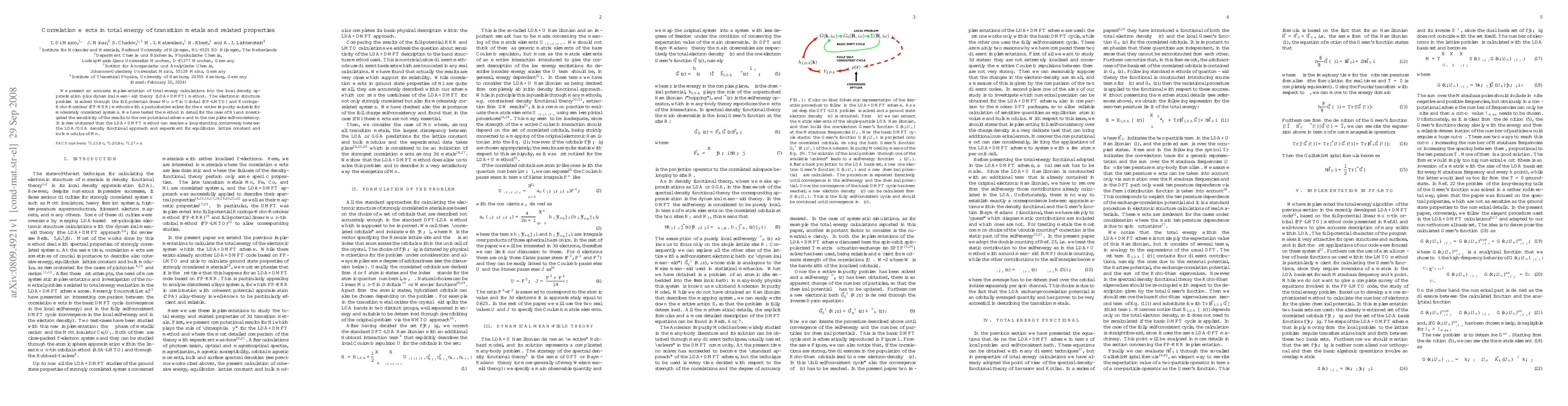 We present an accurate implementation of total energy calculations into the local density approximation plus dynamical mean-field theory (LDA+DMFT) method. The electronic structure problem is solved through the full potential linear Muffin-Tin Orbital (FP-LMTO) and Korringa-Kohn-Rostoker (FP-KKR) methods with a perturbative solver for the effective impurity suitable for moderately correlated systems. We have tested the method in detail for the case of Ni and investigated the sensitivity of the results to the computational scheme and to the complete self-consistency. It is demonstrated that the LDA+DMFT method can resolve a long-standing controversy between the LDA/GGA density functional approach and experiment for equilibrium lattice constant and bulk modulus of Mn.
