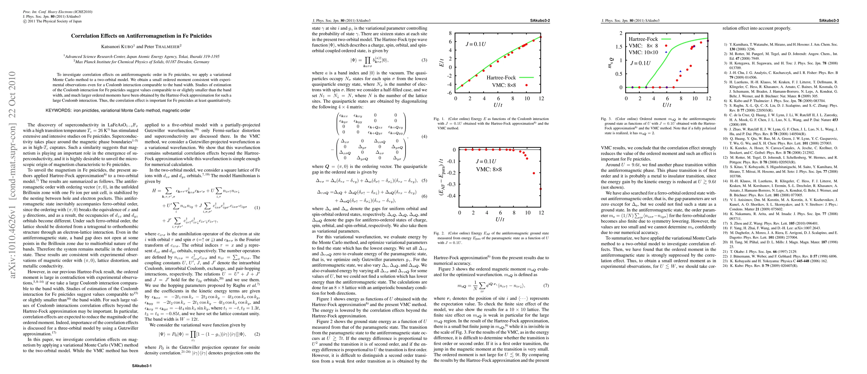 This study uses variational Monte Carlo to explore correlation effects on antiferromagnetism in Fe pnictides, finding a small ordered moment consistent with experiments even with high Coulomb interaction. The results suggest that correlation effects are quantitatively significant in these materials.