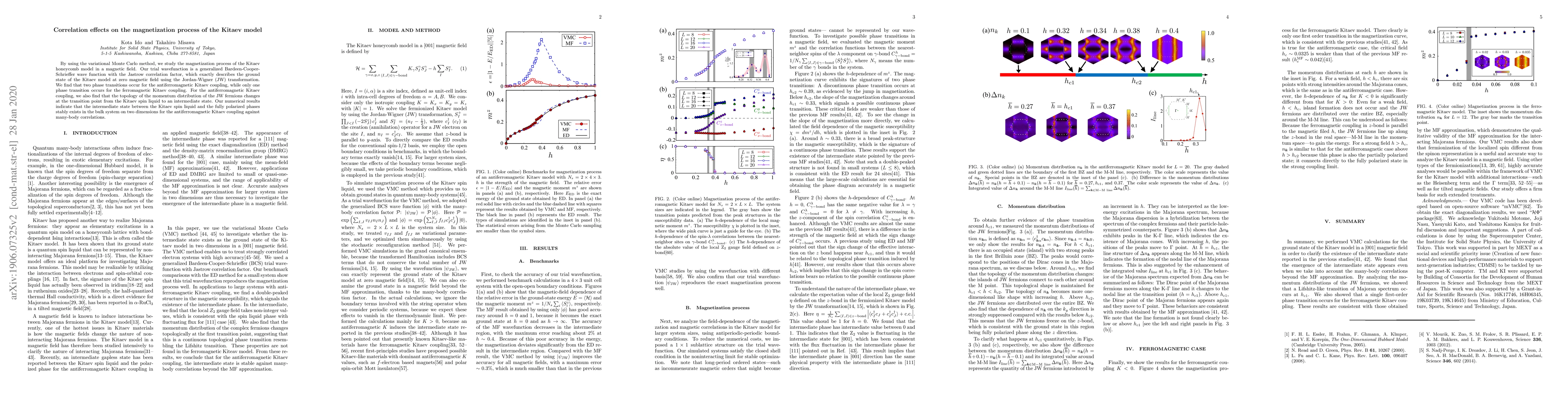By using the variational Monte Carlo method, we study the magnetization process of the Kitaev honeycomb model in a magnetic field. Our trial wavefunction is a generalized Bardeen-Cooper-Schrieffer wave function with the Jastrow correlation factor, which exactly describes the ground state of the Kitaev model at zero magnetic field using the Jordan-Wigner (JW) transformation. We find that two phase transitions occur for the antiferromagnetic Kitaev coupling, while only one phase transition occurs for the ferromagnetic Kitaev coupling. For the antiferromagnetic Kitaev coupling, we also find that the topology of the momentum distribution of the JW fermions changes at the transition point from the Kitaev spin liquid to an intermediate state. Our numerical results indicate that the intermediate state between the Kitaev spin liquid and the fully polarized phases stably exists in the bulk system on two dimensions for the antiferromagnetic Kitaev coupling against many-body correlations.