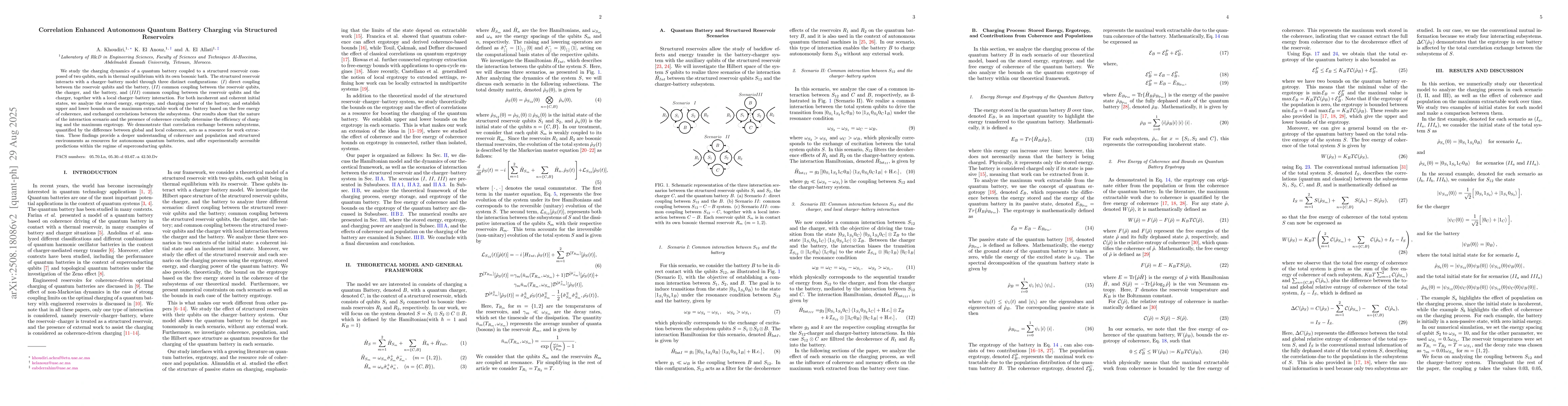 We study the charging dynamics of a quantum battery coupled to a structured reservoir composed of two qubits, each in thermal equilibrium with its own bosonic bath. The structured reservoir interacts with a charger battery model through three distinct configurations: (I) direct coupling between the reservoir qubits and the battery, (II) common coupling between the reservoir qubits, the charger, and the battery, and (III) common coupling between the reservoir qubits and the charger, together with a local charger battery interaction. For both incoherent and coherent initial states, we analyze the stored energy, ergotropy, and charging power of the battery, and establish upper and lower bounds on the maximum extractable work of the battery based on the free energy of coherence, and exchanged correlations between the subsystems. Our results show that the nature of the interaction scenario and the presence of coherence crucially determine the efficiency of charging and the maximum ergotropy. We demonstrate that correlation exchange between subsystems, quantified by the difference between global and local coherence, acts as a resource for work extraction. These findings provide a deeper understanding of coherence and population and structured environments as resources for autonomous quantum batteries, and offer experimentally accessible predictions within the regime of superconducting qubits.