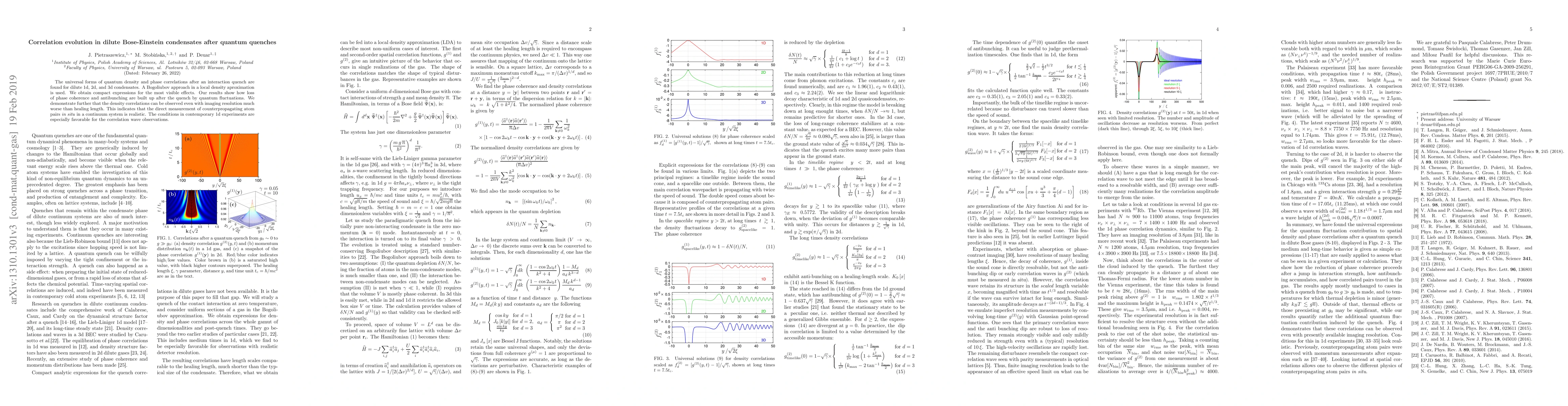 The universal forms of quantum density and phase correlations after an interaction quench are found for dilute 1d, 2d, and 3d condensates. A Bogoliubov approach in a local density aproximation is used. We obtain compact expressions for the most visible effects. Our results show how loss of phase coherence and antibunching are built up after the quench by quantum fluctuations. We demonstrate further that the density correlations can be observed even with imaging resolution much worse than healing length. This indicates that the direct measurement of counterpropagating atom pairs in situ in a continuum system is realistic. The conditions in contemporary 1d experiments are especially favorable for the correlation wave observations.