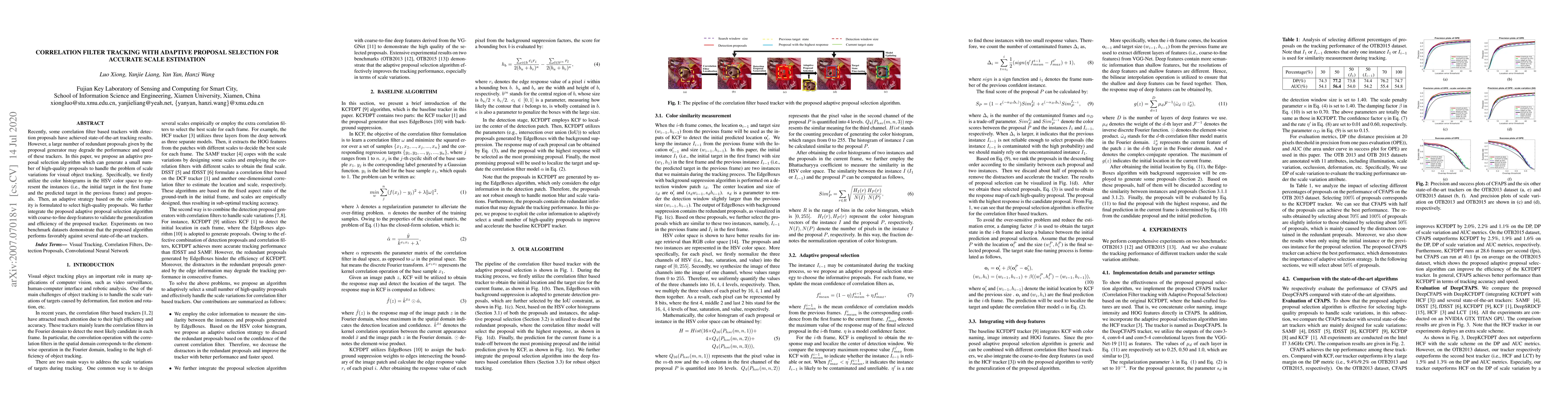 This paper proposes an adaptive proposal selection algorithm for correlation filter tracking to improve accuracy and efficiency in handling scale variations. The method uses color histograms in HSV space to select high-quality proposals, integrating with deep features for enhanced performance, outperforming other state-of-the-art trackers in benchmark tests.