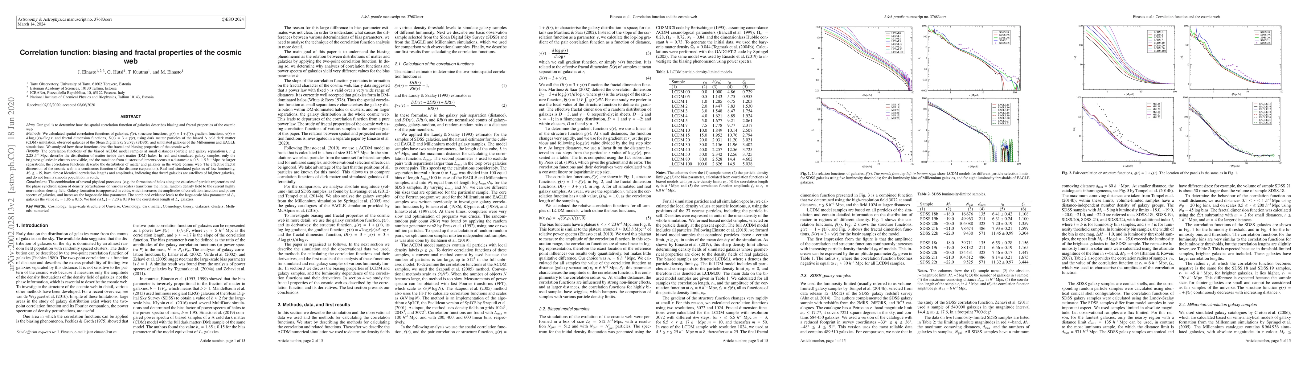 This paper investigates spatial correlation functions of galaxies to analyze fractal properties and biasing in the cosmic web. It finds that the correlation functions at small distances describe matter distribution within dark matter halos, while the transition from clusters to filaments occurs at around 0.8-1.5 Mpc. The study concludes that dwarf galaxies are satellites of brighter galaxies, and the large-scale bias parameter for $L_\star$ galaxies is $b_\star = 1.85 \pm 0.15$, with a correlation length of $r_0(L_\star) = 7.20 \pm 0.19$.