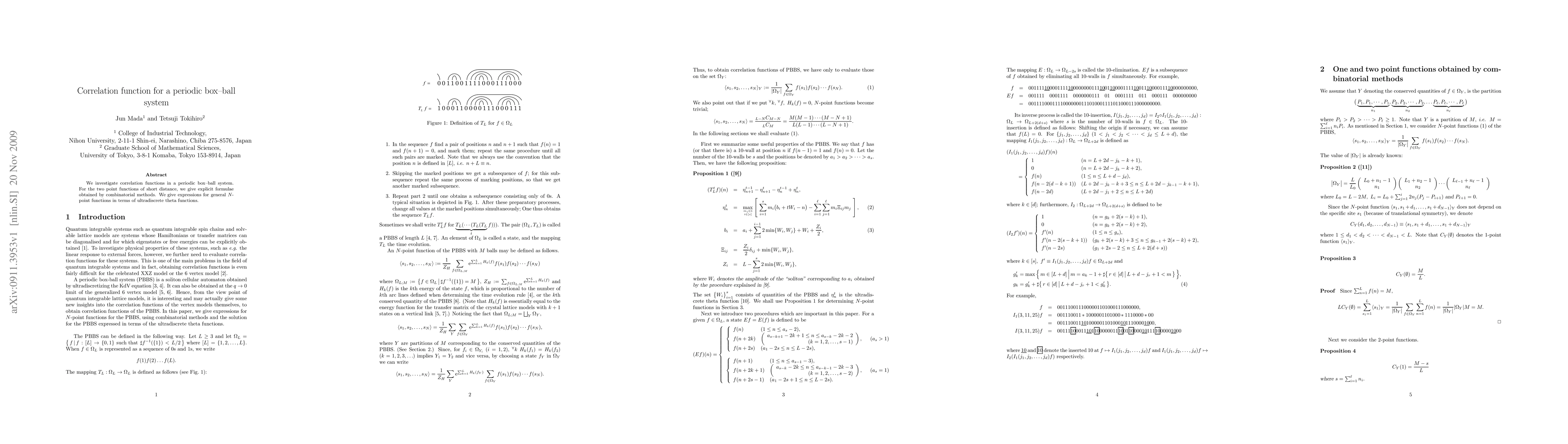 This paper explores correlation functions in a periodic box-ball system, providing explicit formulae for two-point short distance functions via combinatorial methods and general N-point functions expressed in terms of ultradiscrete theta functions.